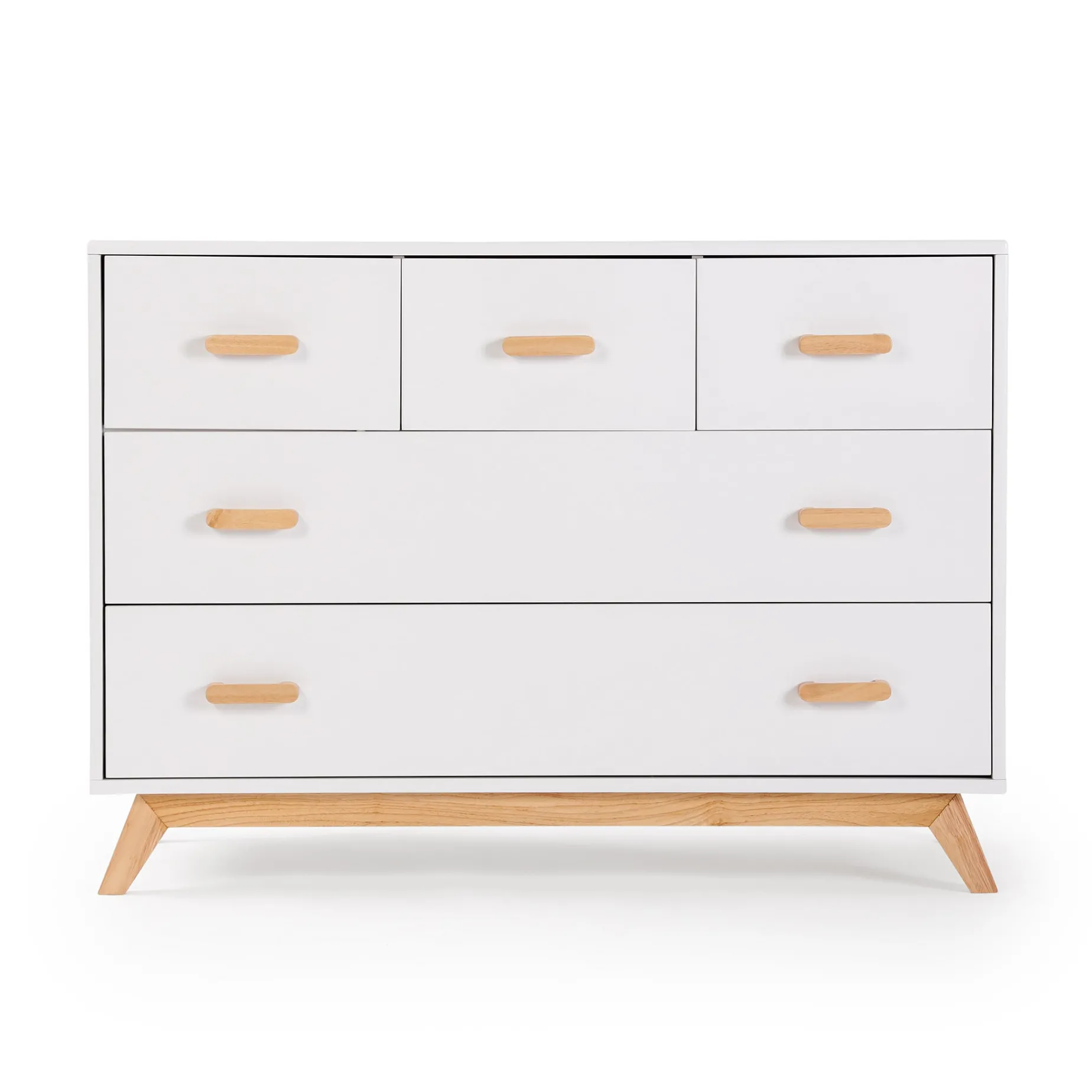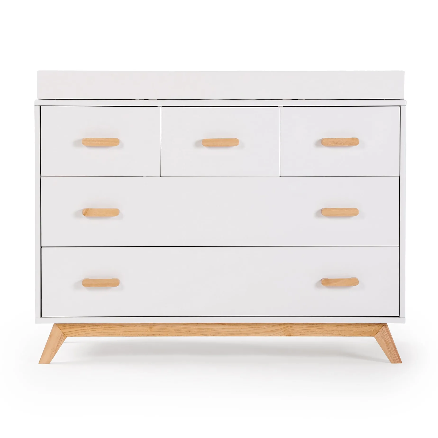 The 48” modern Soho 5-drawer Dresser’s classic style pairs perfectly with the Soho 3-in-1 Crib, or adds a pop of mid-century style to any room on its own.Safe, stable, and strong, with sturdy angled legs and solid wood handles, forged steel support, and a baby-safe painted finish.