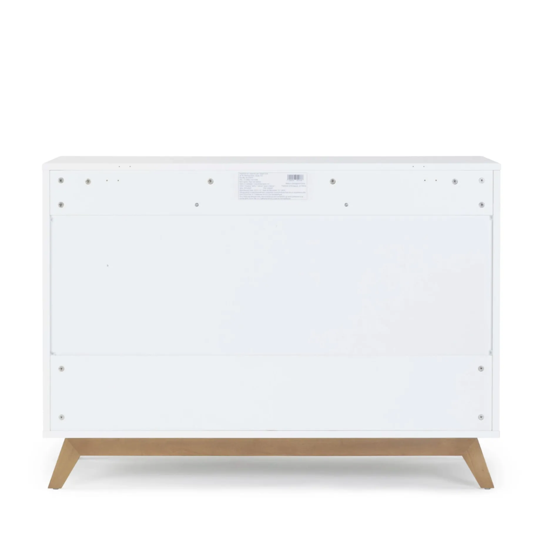The 48” modern Soho 5-drawer Dresser’s classic style pairs perfectly with the Soho 3-in-1 Crib, or adds a pop of mid-century style to any room on its own. Safe, stable, and strong, with sturdy angled legs and solid wood handles, forged steel support, and a baby-safe painted finish.