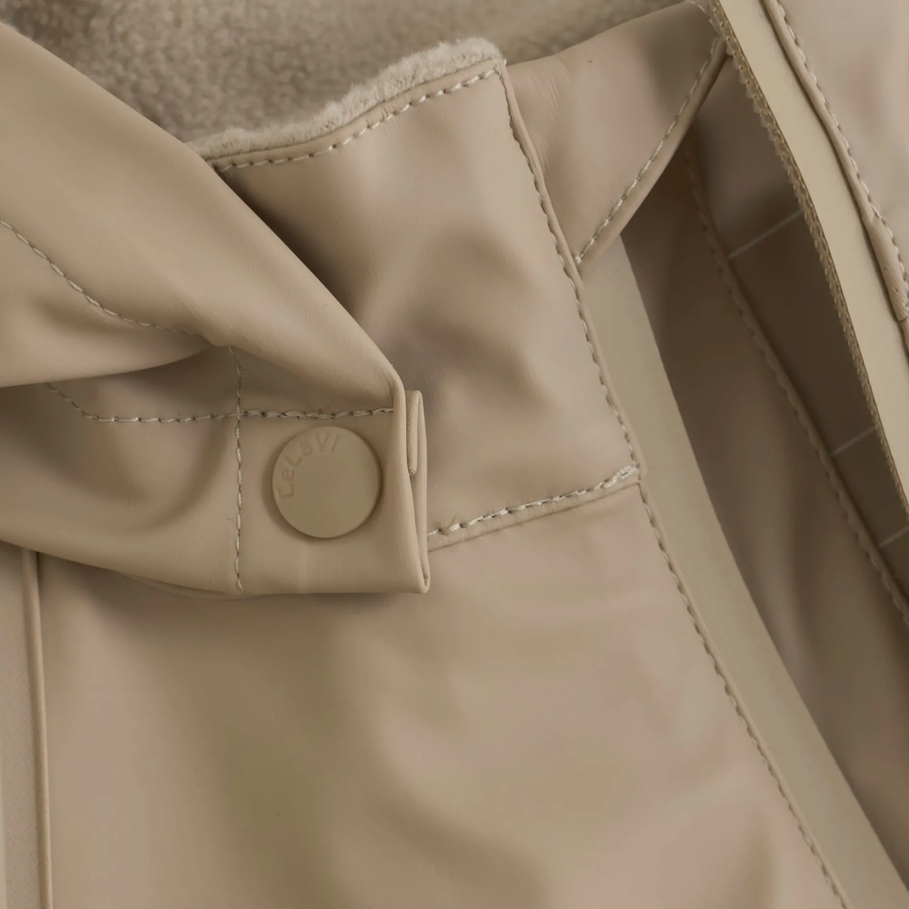 A superb PU rain suit from CeLaVi. It features narrow reflective strips around one sleeve and one leg. The upper arm and hood are adorned with reflective logos. The CeLaVi rain suit has a detachable hood that attaches with a snap-button collar. The hood opening, sleeves, and waist have elastic for a better fit. There are practical, adjustable elastic straps to go under your shoes. The rain suit closes at the front with a zipper and an external windproof flap that closes with snap buttons. Certified according to GRS – Made with 66% recycled materials CERES-0366