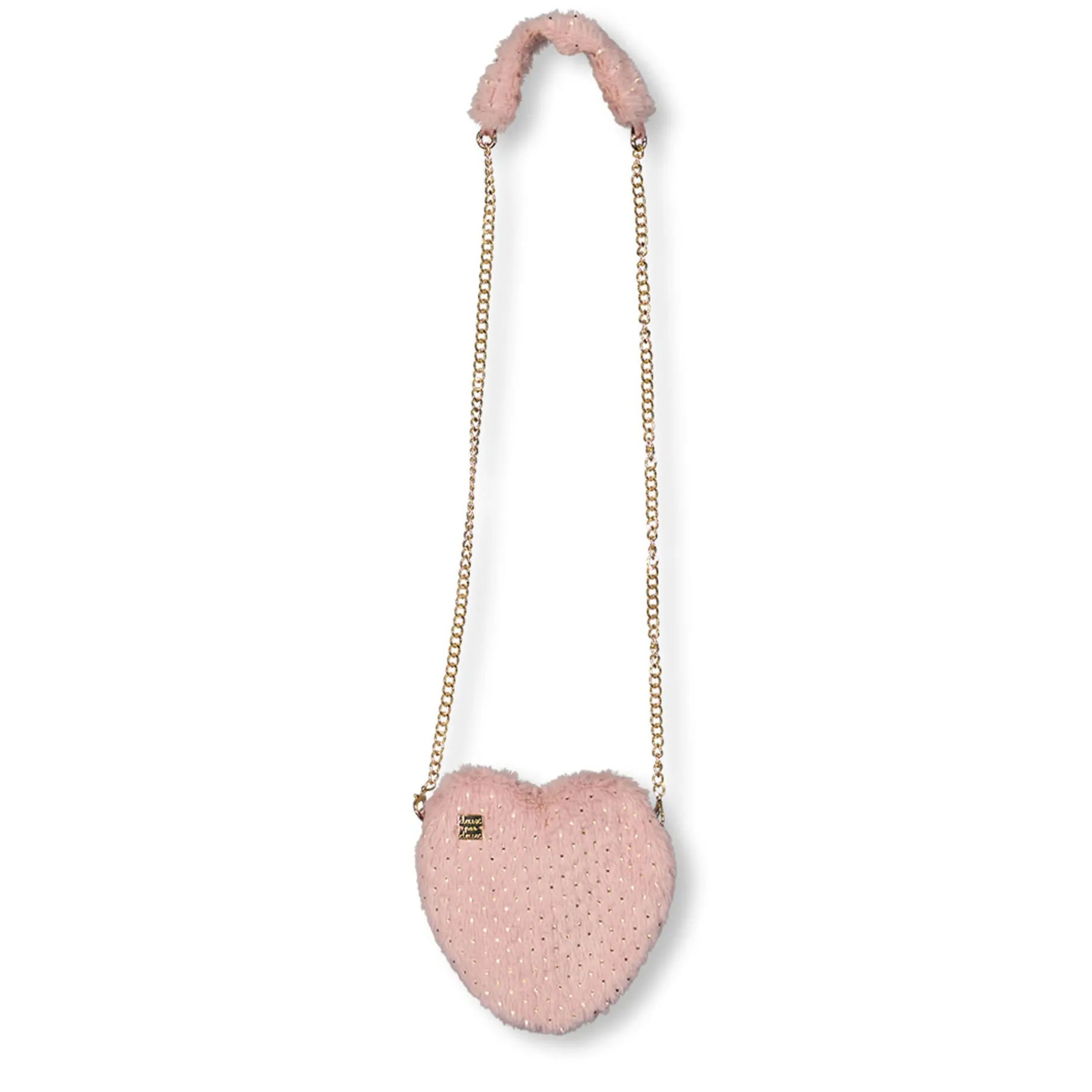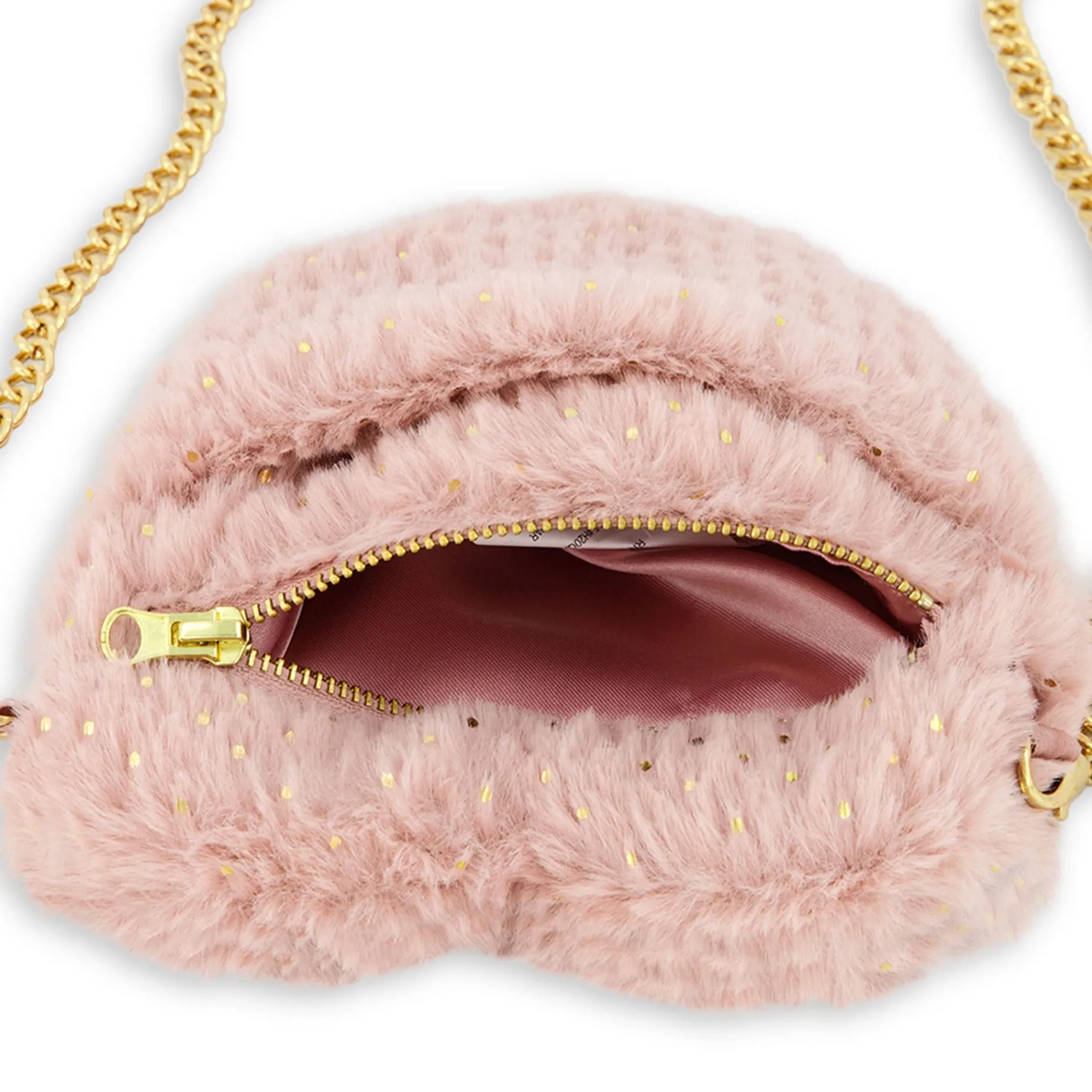 Add a sweet touch of pink to any outfit in our Starry Night collection with this ultra-soft faux fur handbag. Detailed with a shimmering dot pattern for a touch of sparkle, this versatile purse has a ladylike look and feel with a heart-shaped silhouette and a chain strap that can be carried over the shoulder or slung across the body.