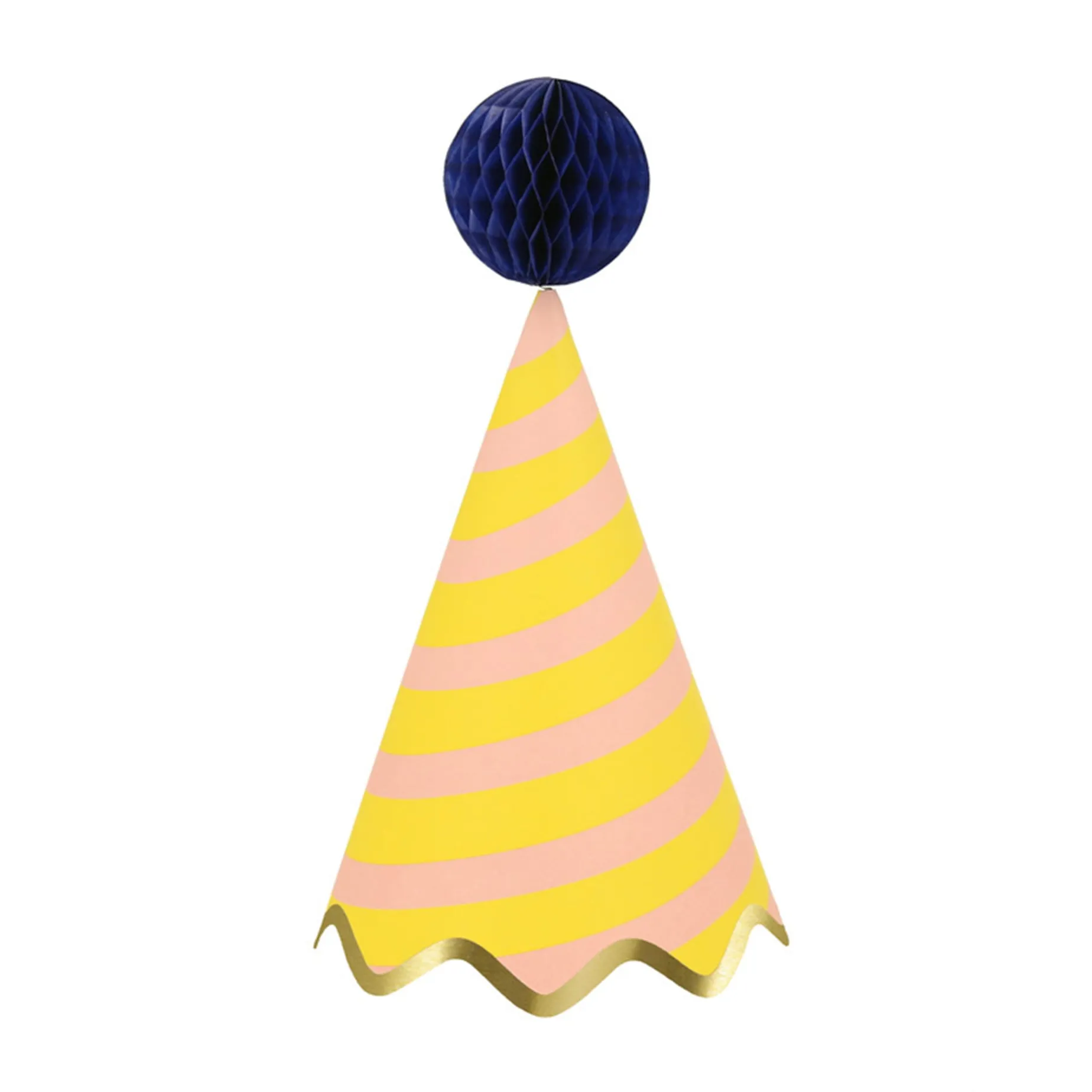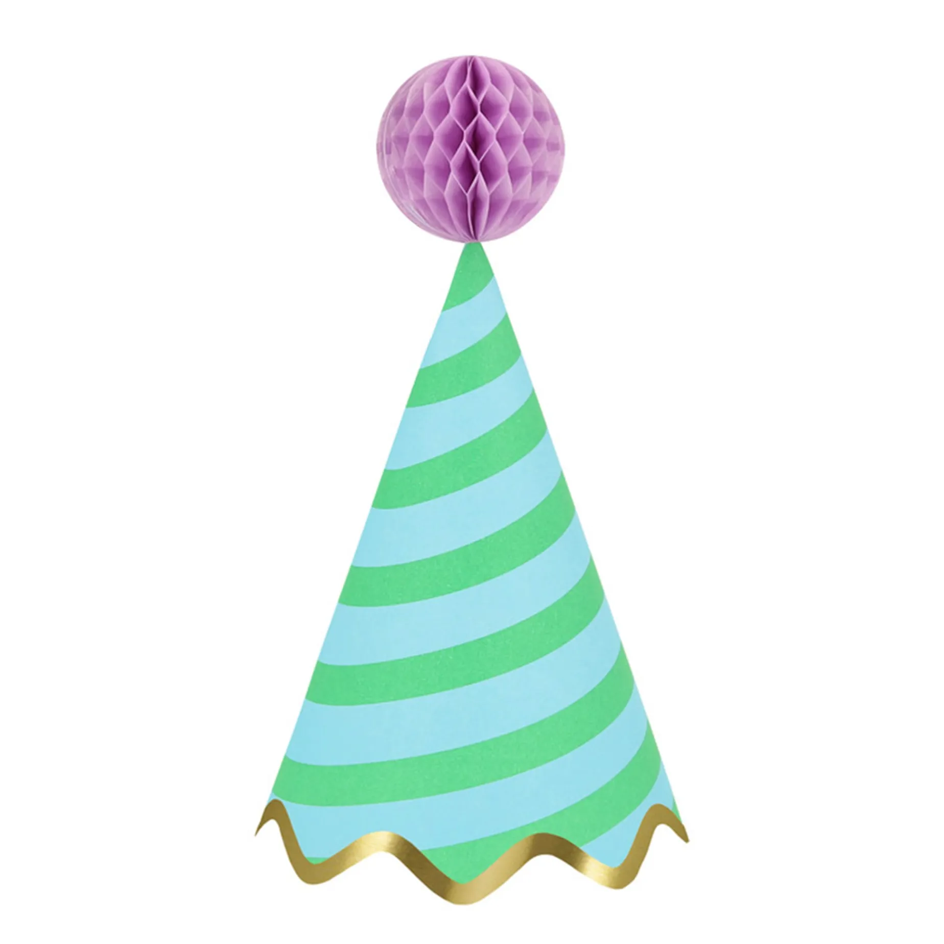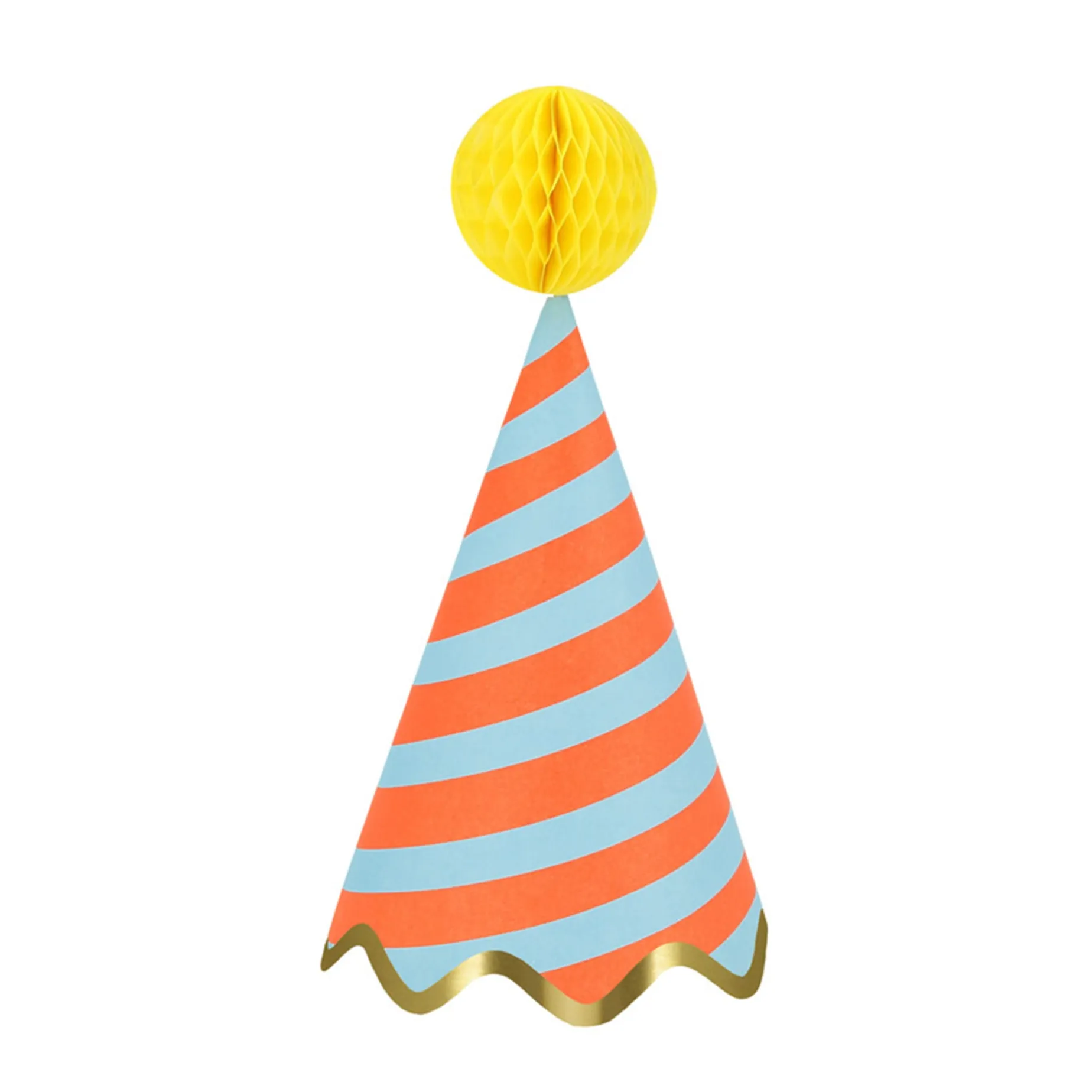 -Party hats in 8 bright colors1.57 inch honeycomb balls in 8 complementary colors. They come with double sided tape to hold them open, and wire inside to allow them to be moveable.