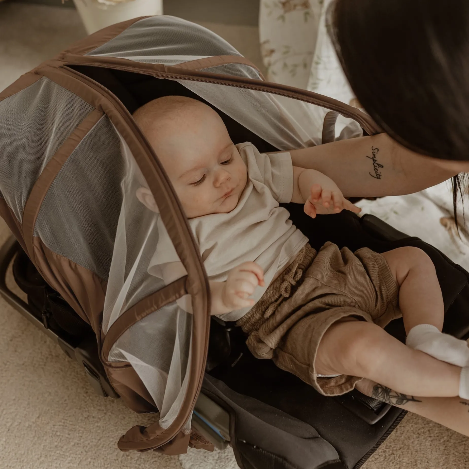 Its water-resistant fabric repels light rain while maintaining good airflow around baby, preventing any discomfort from heat buildup under the cover.