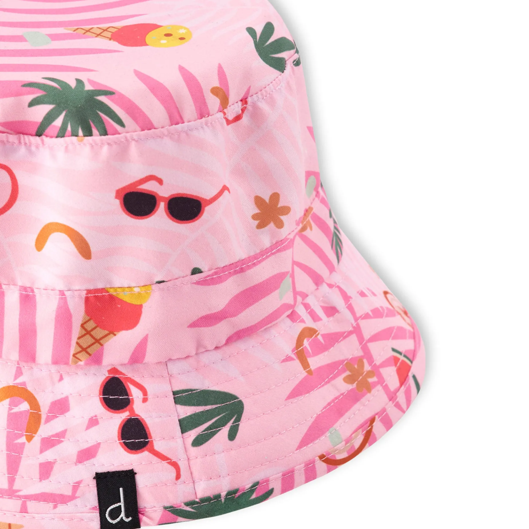 Bring a bloom of charm to sunny days with this beach hat in purple with flower print. Designed with wide brim protection and a pretty allover floral motif, this hat adds both style and shade to outdoor fun. The practical chin straps keep it securely in place, while the recycled polyester fabric with soft lining ensures comfort all day long. Pair it with any outfit from our “Like A Fish To Water” collection. Please note that there are no drawstrings in children’s size 2/3 & 4/5.