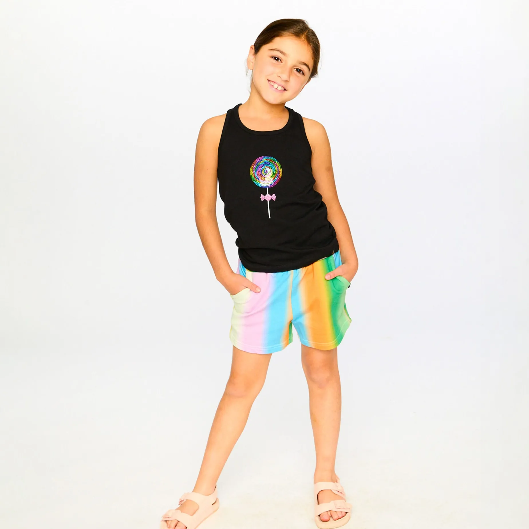 The organic cotton jersey tank top in black is a playful essential for warm days. This sleeveless tee features a round neckline, racerback cut, and a fun sequin lollipop appliqué at the chest. Made from soft organic cotton with a touch of elastane, it offers comfort, stretch, and breathability while being eco-friendly.Sizes 2 and 3 years are designed without detachable 3D embellishments to ensure young children’s safety.