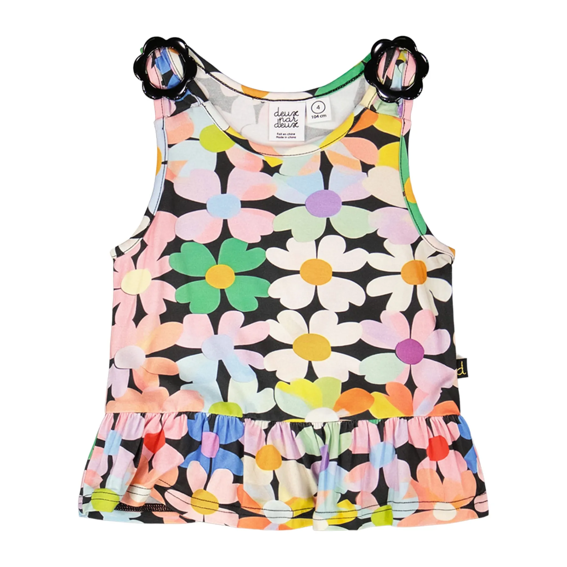 The jersey tank top black with printed flowers adds a vibrant splash of color to everyday outfits. This sleeveless top features a round neckline, delicate flower-shaped buckles at the straps, and a ruffled hem at the bottom for a playful twist. Made from soft viscose with added elastane, it ensures comfort, flexibility, and a lightweight feel for summer days.