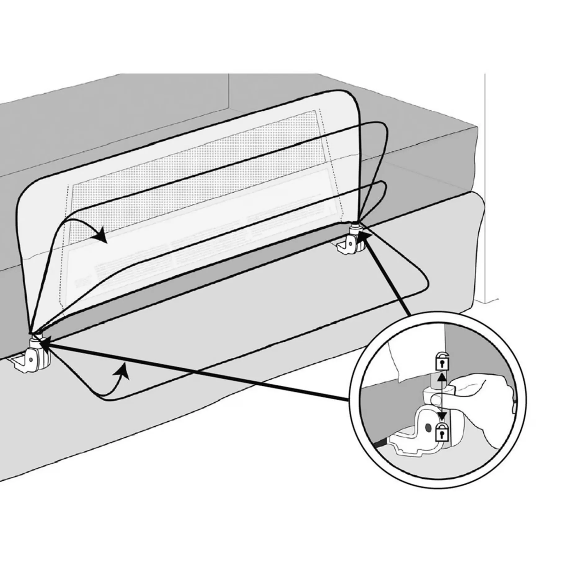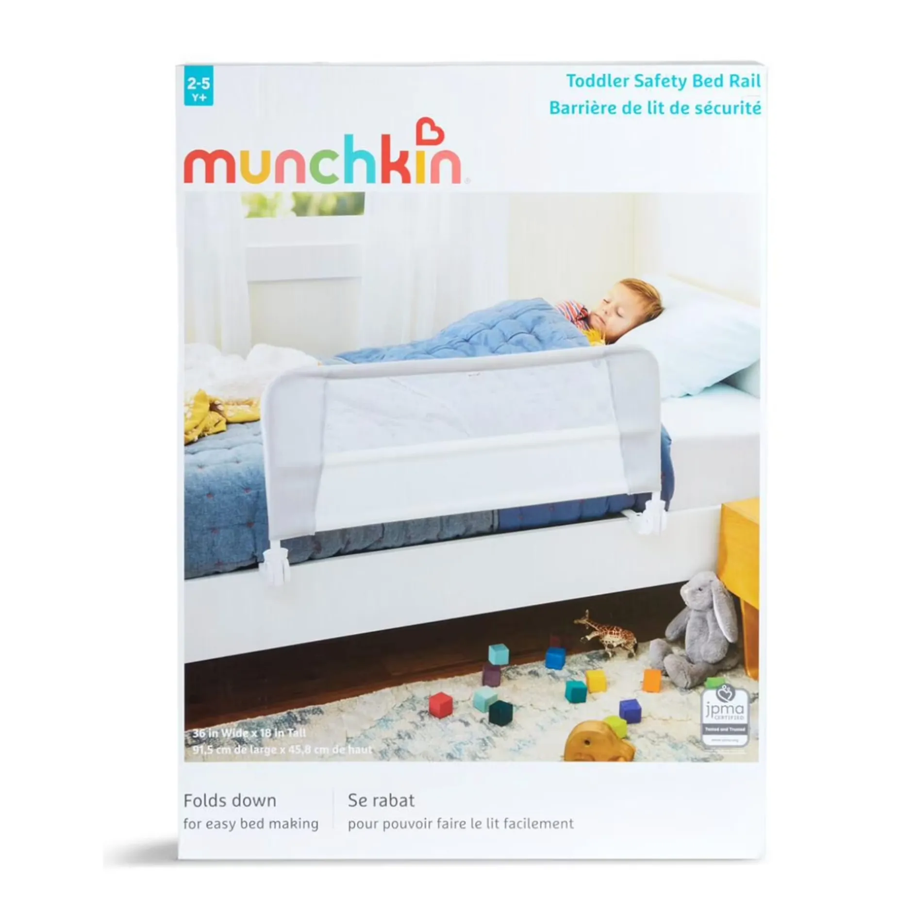 The Munchkin Safety Toddler Bedrail keeps your little one safe and sound while in bed. The lightweight extendable metal frame is padded and covered with fabric, fitting mattress sizes twin to queen. The secure locking mechanism and convenient hinged folding design makes lifting your child and changing their bedding easy. And to make your life even easier, there is no assembly required.