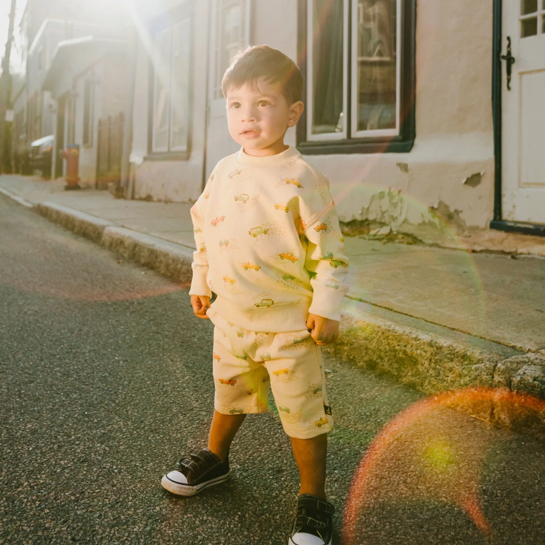 The French terry sweatshirt in beige with jeep print is designed for little explorers on the move. Made from a comfy blend of cotton and elastane, this crewneck sweatshirt with ribbed trims offers softness with just the right amount of stretch. With its allover jeep print, it’s part of our “Trail Buddies” collection and brings playful energy to everyday adventures.