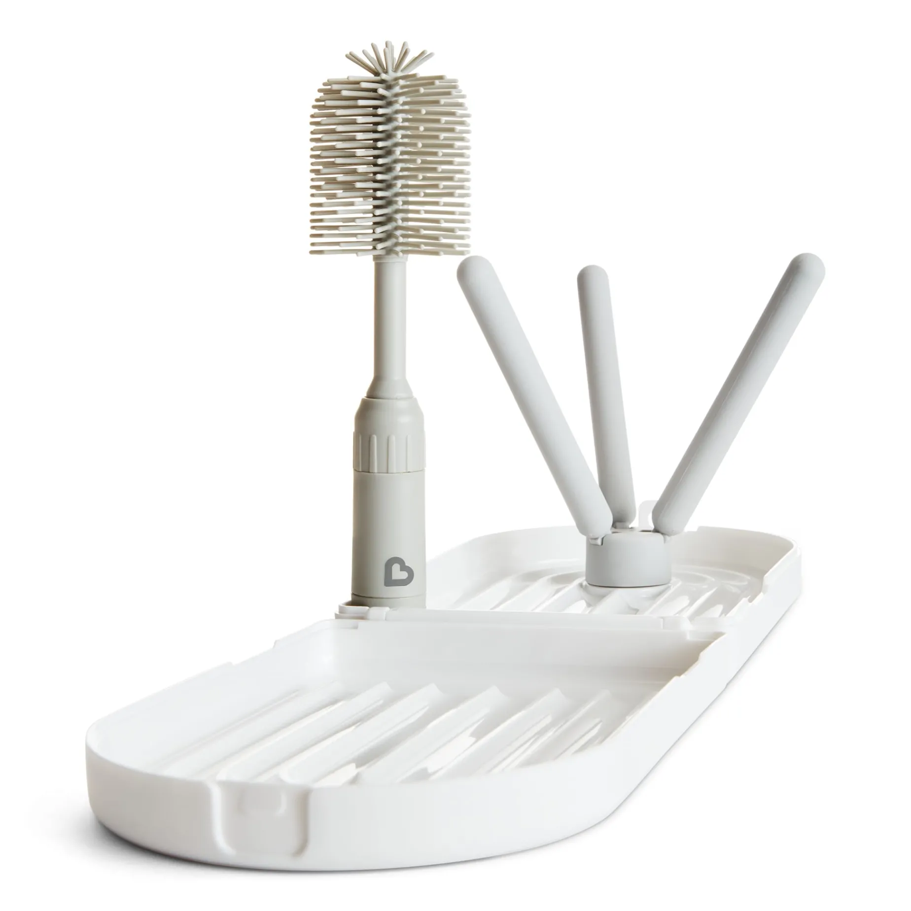 Bottle cleaning never takes a vacation – even when you do. Whether it’s a weekend away or a quick trip to grandma’s house, Munchkin’s Portable Drying Rack is the best travel companion to take in your diaper bag. Designed to make bottle care easier away from home, this compact rack has angled pegs for faster drying, plus extra space for nipples, pacifiers, and pump parts. It even comes with an extendable brush to help you keep baby’s feeding essentials sparkling clean on the go. Dry up to three bottles at a time, wherever you are. Bottle washing problems, solved!