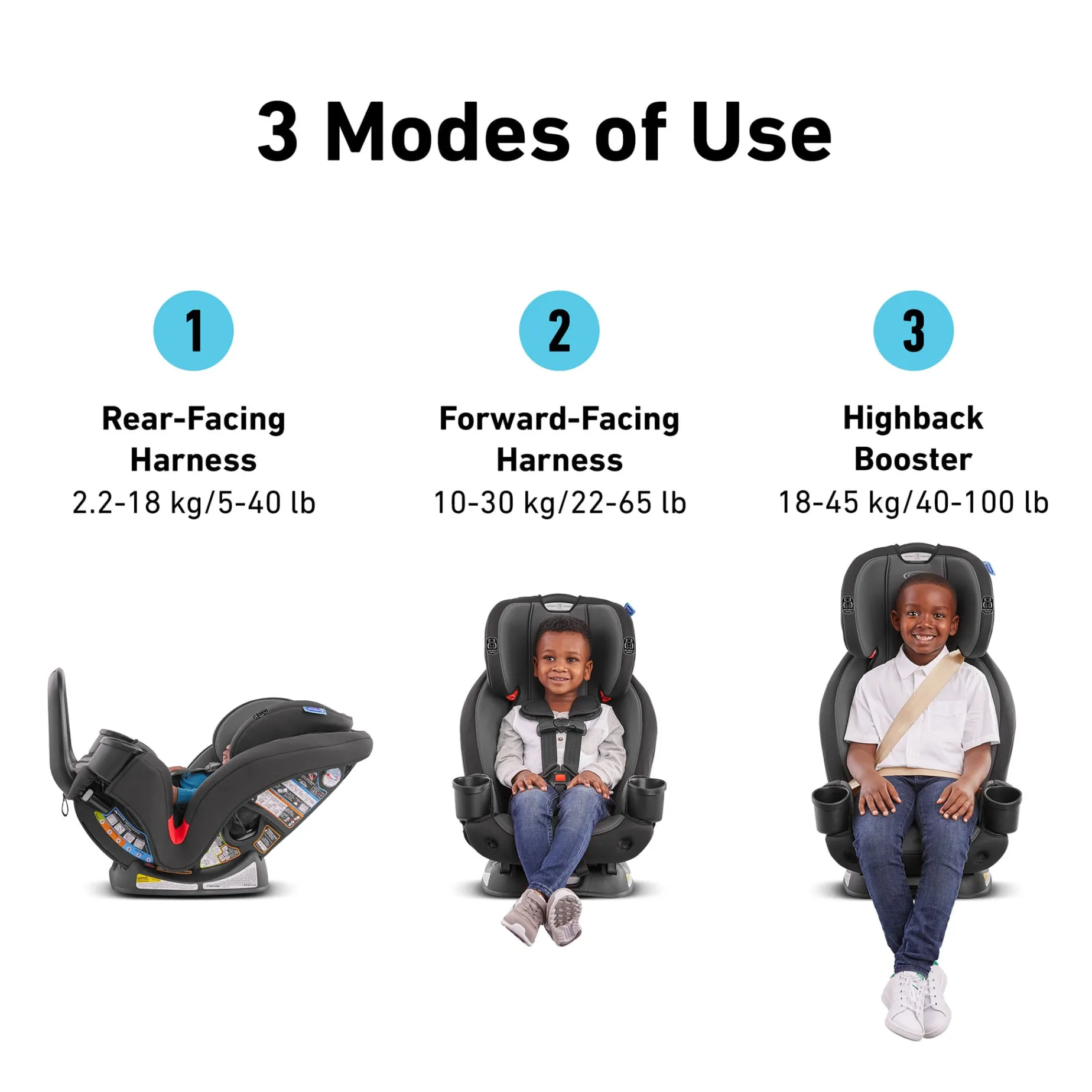 -3-in-1 car seat helps protect your child from 2.2 -45 kg (5-100 lb)