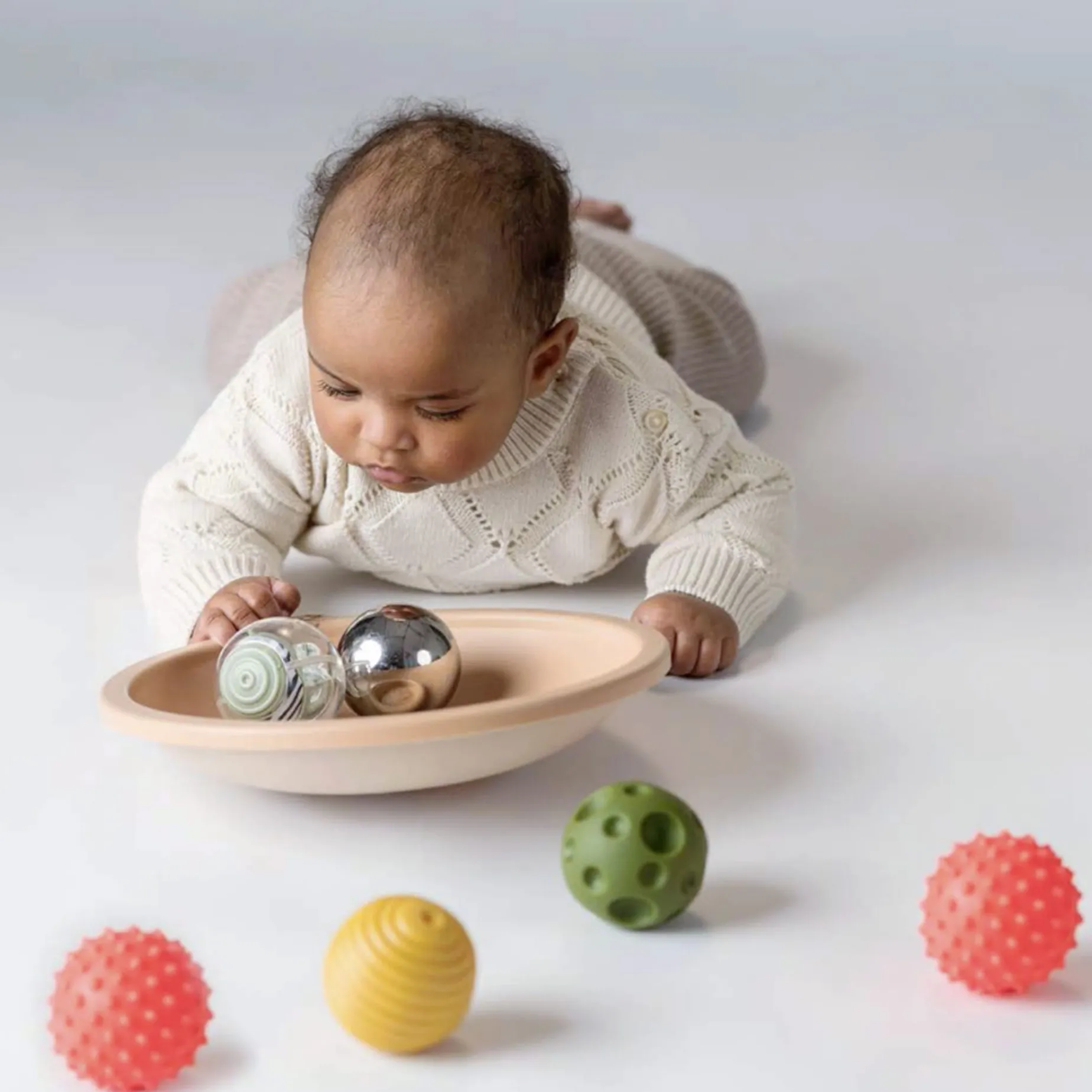 Designed to make tummy time more engaging and beneficial for babies, the rounded base gently sways with the baby’s touch, encouraging movement and exploration. This interactive tray features 5 sensory balls, each uniquely designed to enhance tactile stimulation, fine motor skills, and cause-and-effect learning. This innovative play tray supports muscle development by keeping babies engaged during tummy time, encouraging longer and more active play sessions. With its multi-sensory features, it helps strengthen hand-eye coordination, core muscles, and cognitive development. This action tray offers a unique, interactive solution for promoting tummy time engagement—a crucial stage in early development.