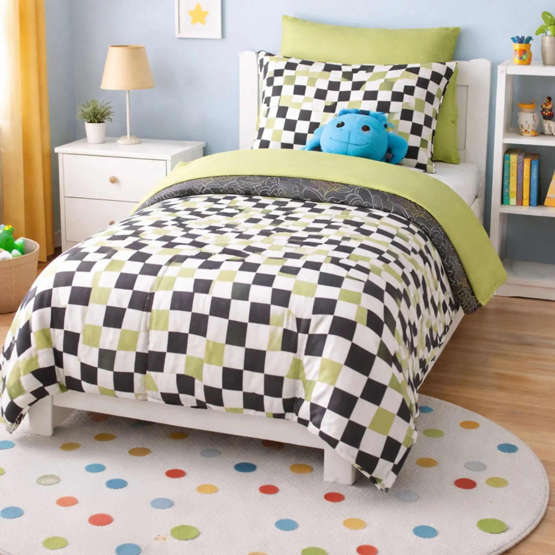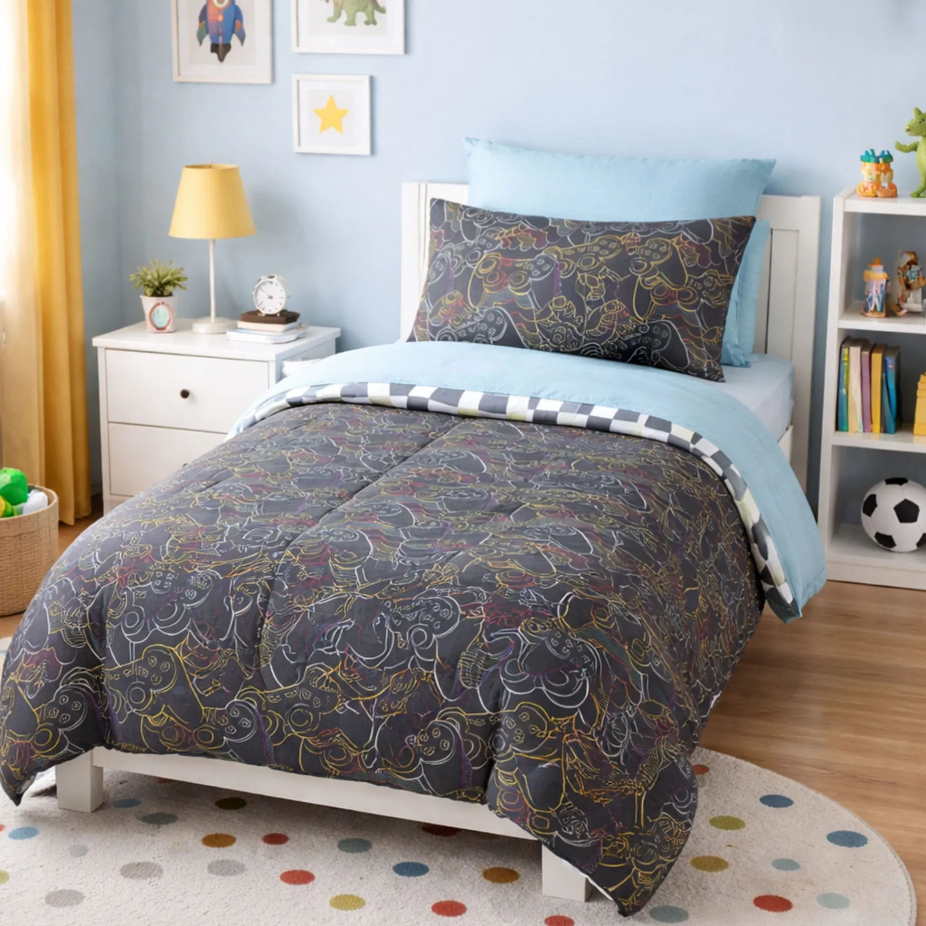 The set includes: reversible comforter, 1 reversible standard shams, 1 reversible standard pillowcases, 1 dual-pattern flat sheet, 1 dual-pattern fitted sheet