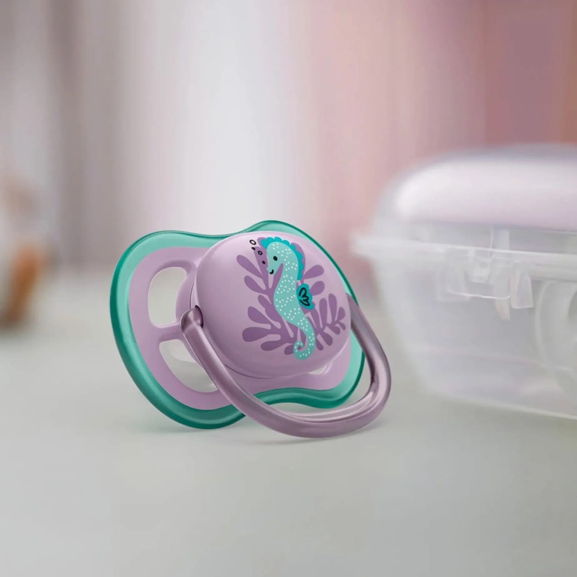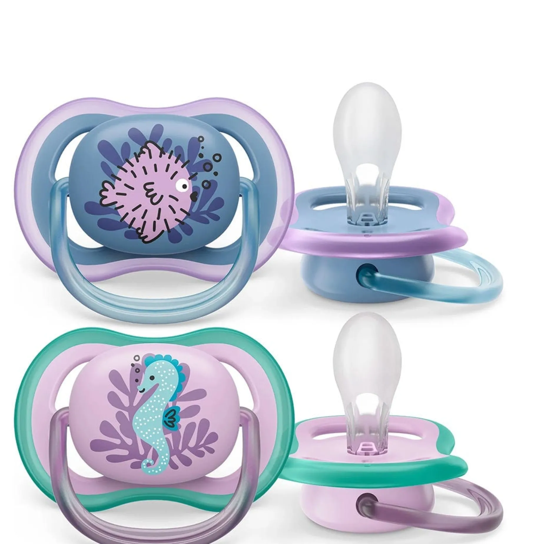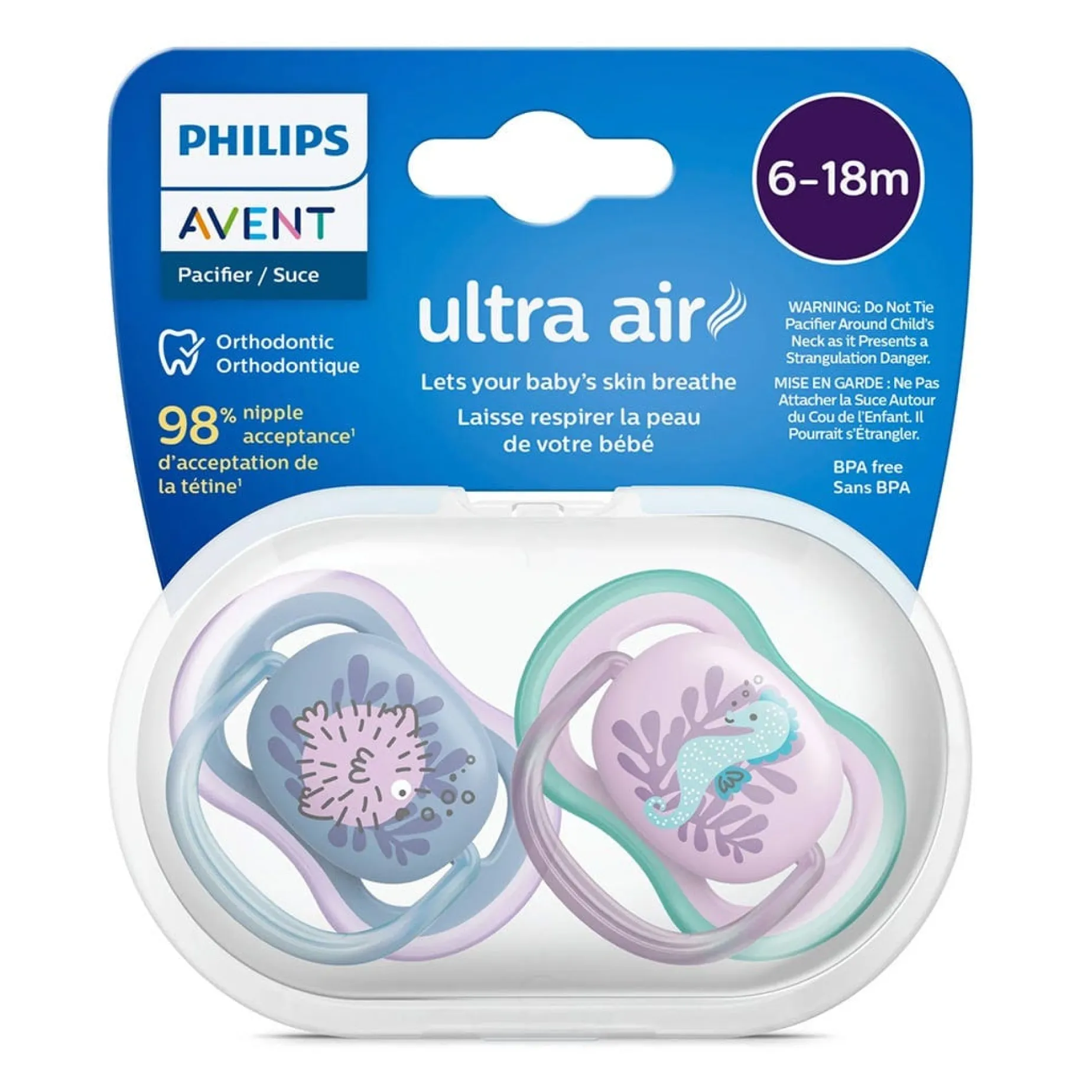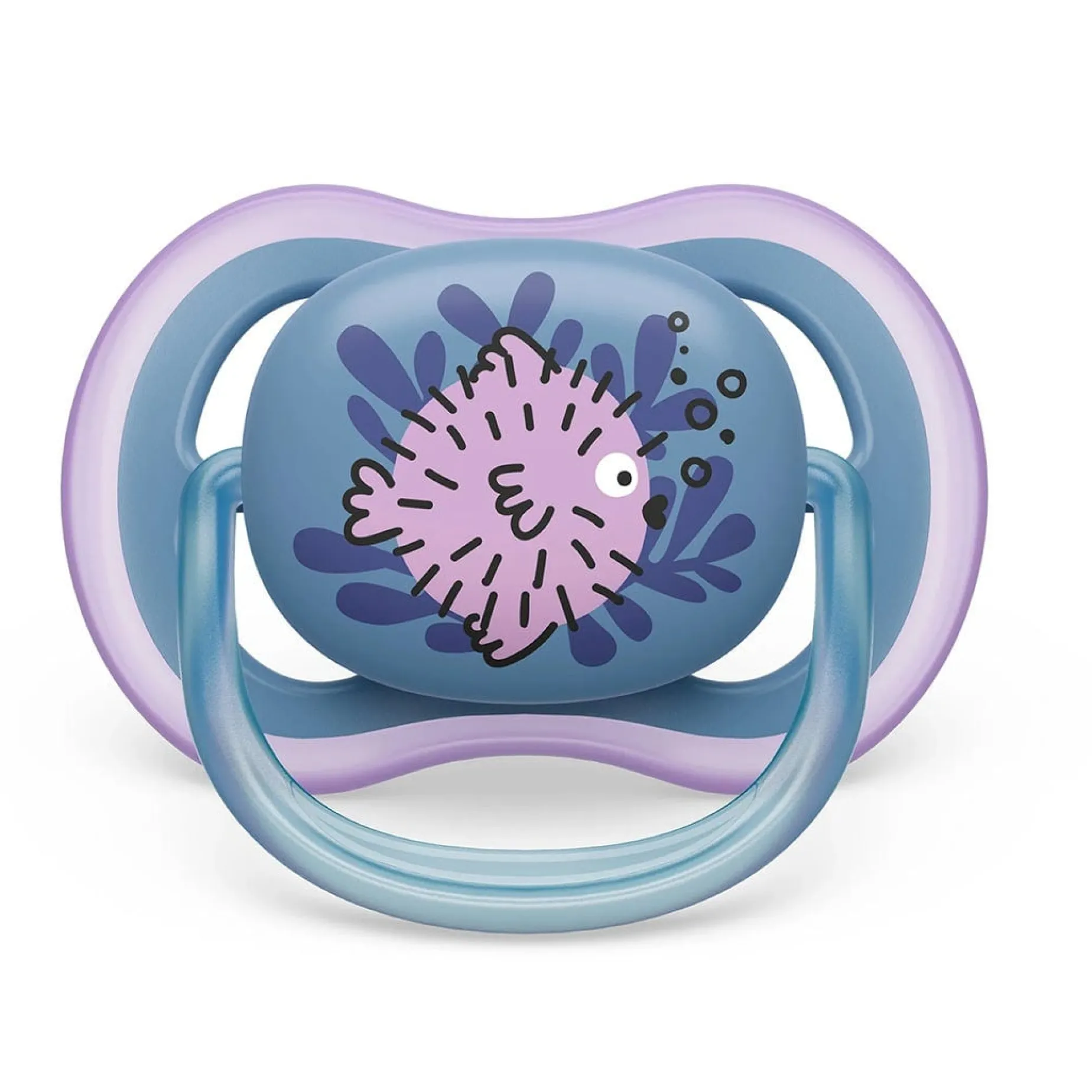 The Philips Avent Ultra Air pacifier for babies 6-18 months is designed with a lightweight, breathable shield for baby’s sensitive skin.