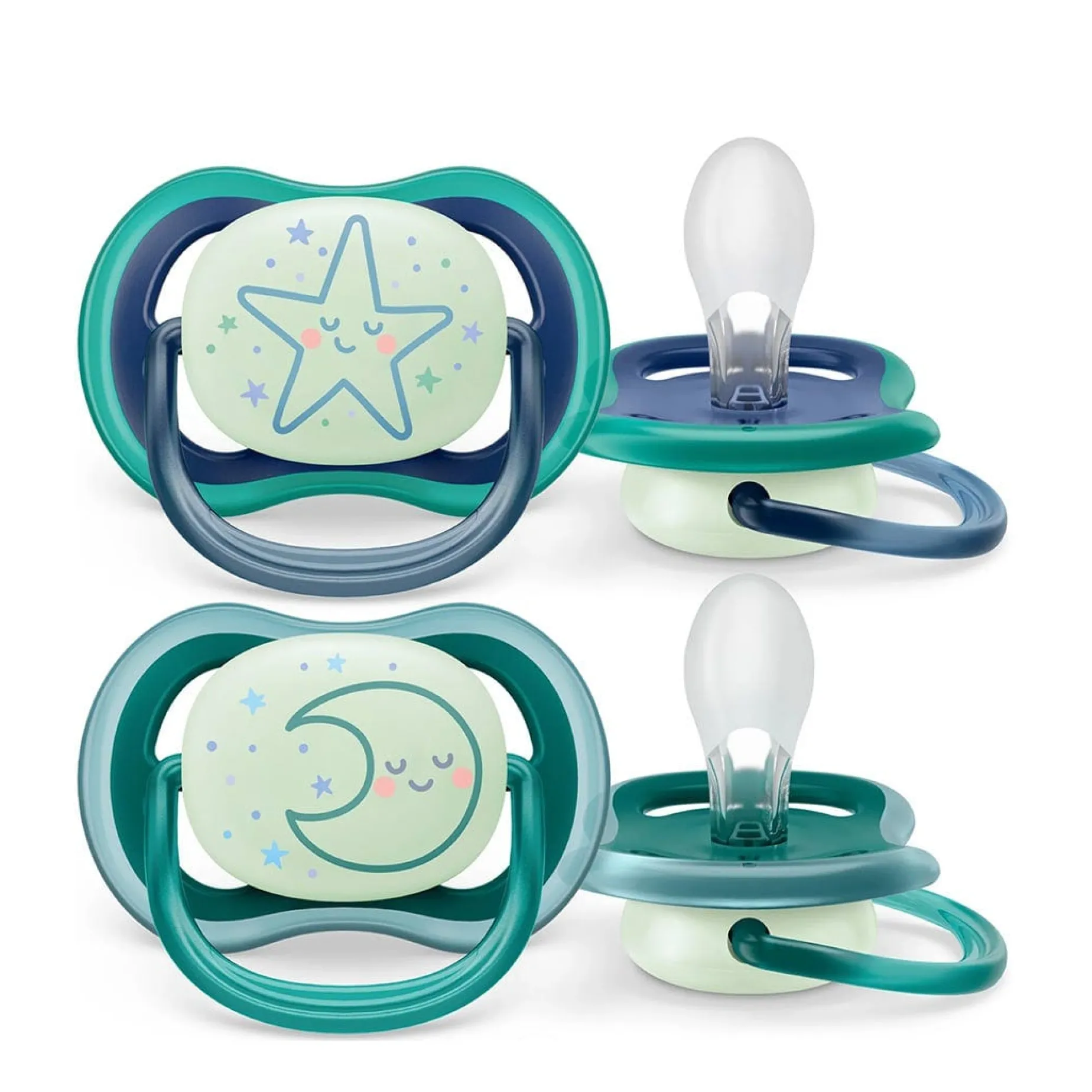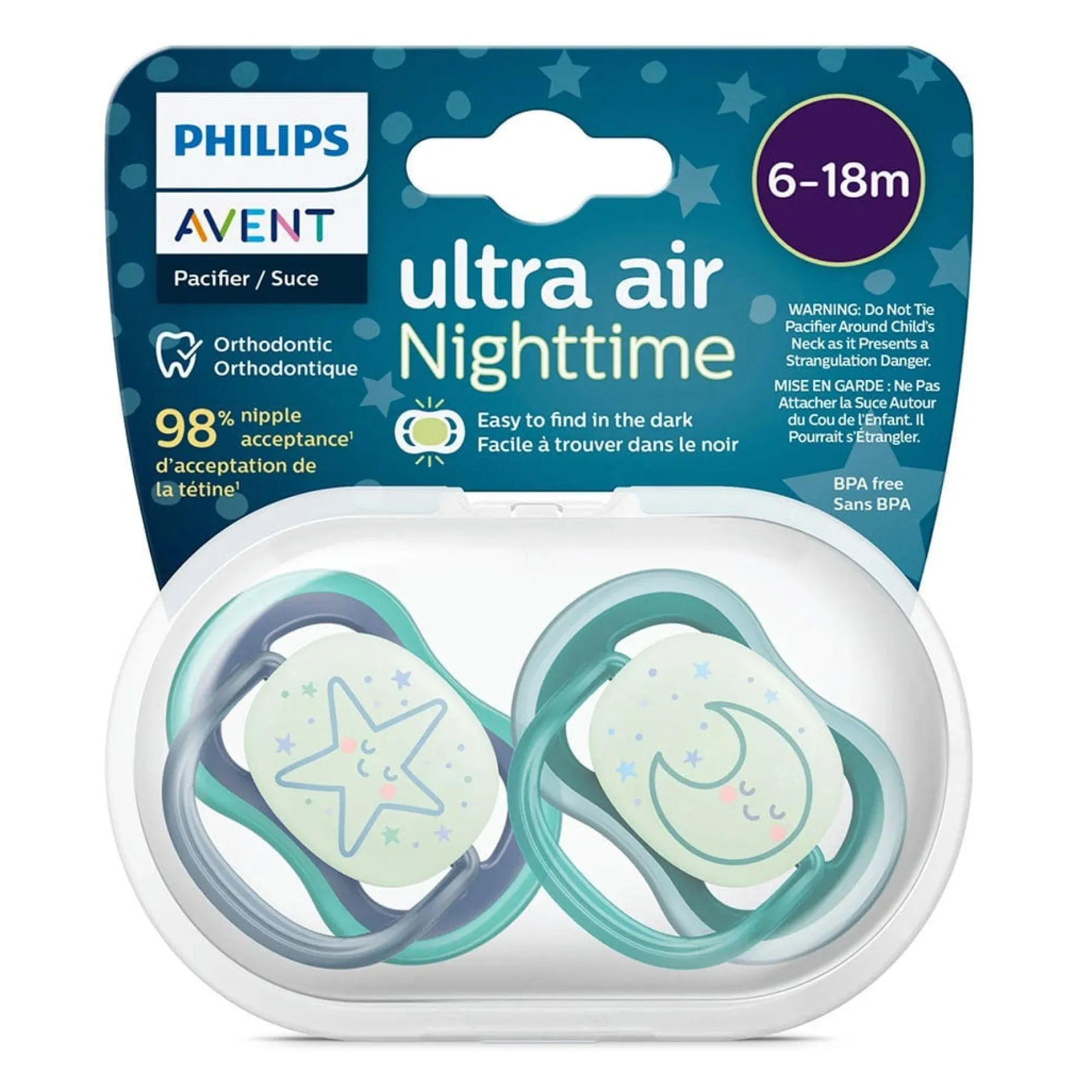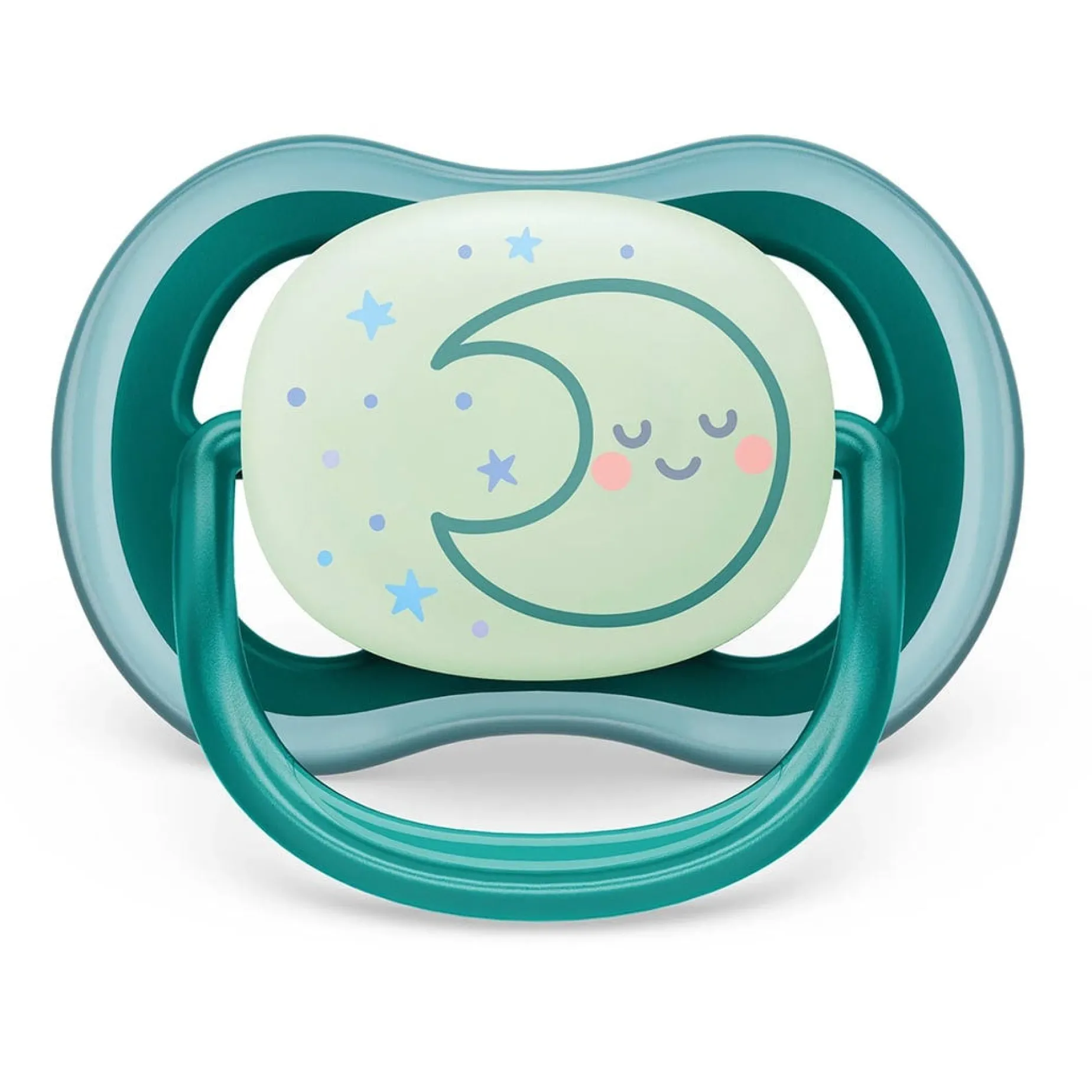 The Philips Avent Ultra Air pacifier for babies 6-18 months has a long lasting glow, so it’s easy to find in the dark. It’s designed with a lightweight, breathable shield for baby’s sensitive skin.