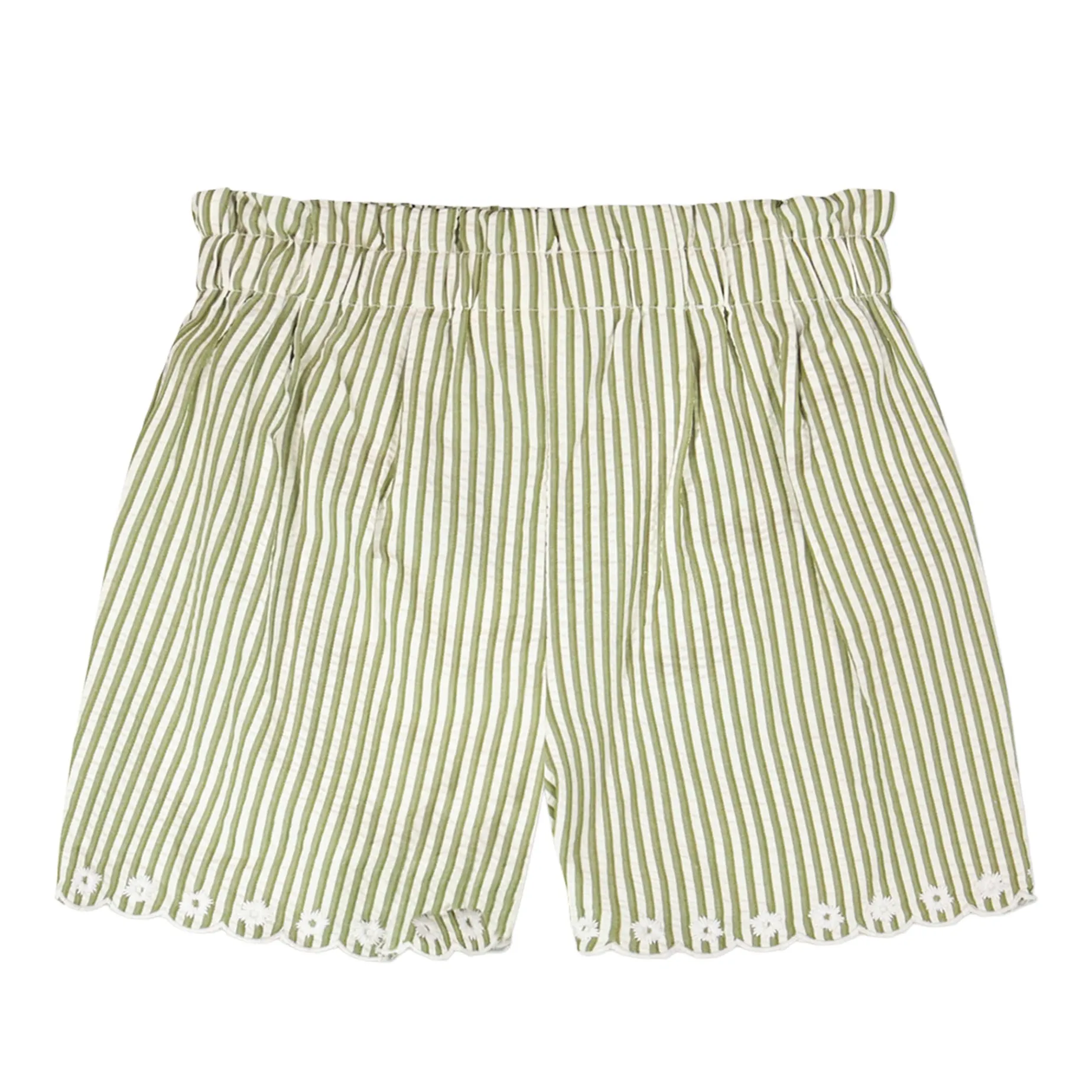 The shorts in green and off white stripes with embroidery bring a chic twist to casual wear. These bottoms are designed with delicate embroidered bottom hems, an adjustable tie at the waist, and a breezy striped fabric that gives both comfort and style. Made from a soft polyester and cotton blend, they are ideal for pairing with any top from the “Under My Straw Hat” collection.