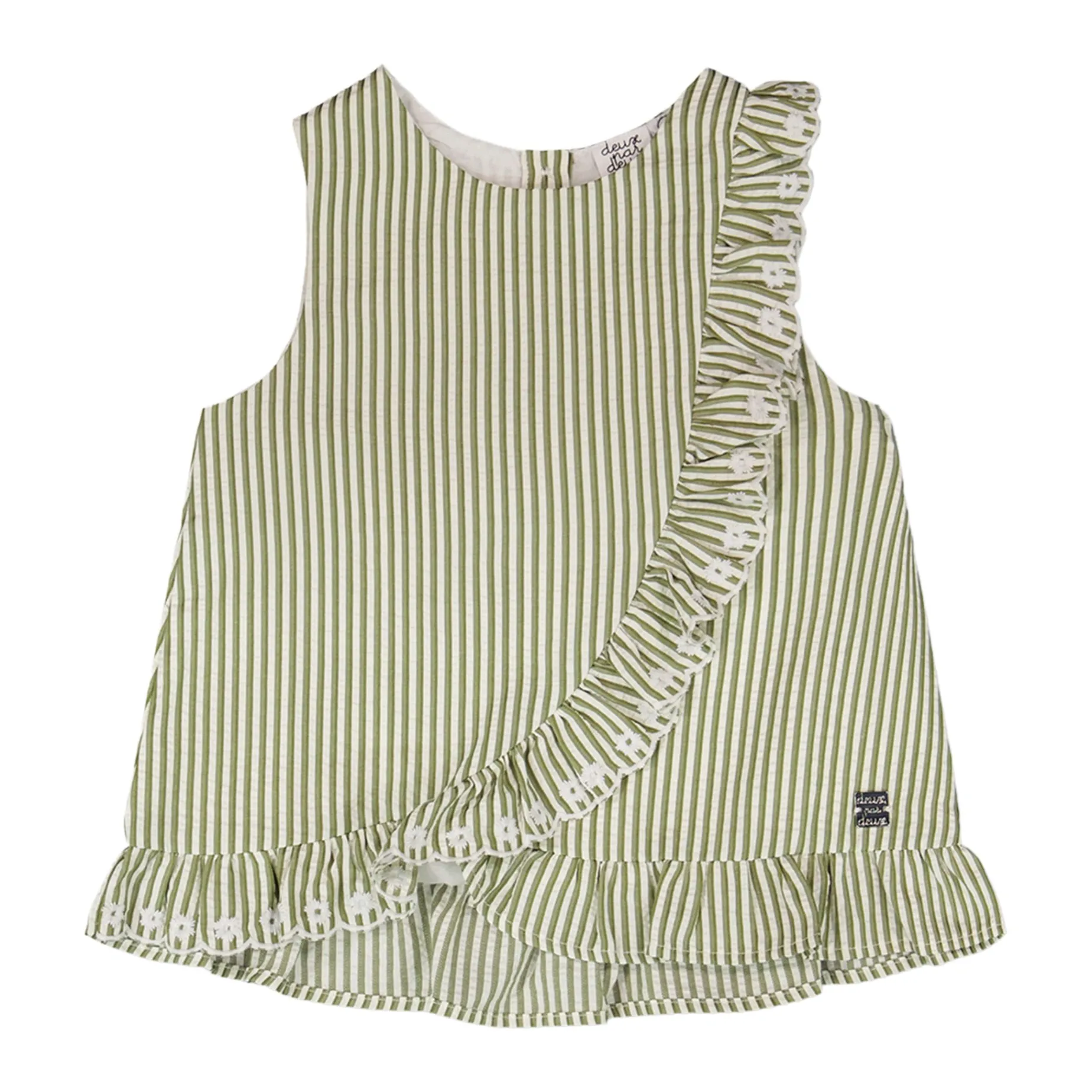 The top in green and off white stripes with embroidered ruffle brings a delicate, feminine touch to summer looks. This sleeveless blouse features a round neckline, vertical stripes, a back button closure, and an asymmetrical ruffle adorned with floral embroidery that cascades across the front. Made from a soft polyester-cotton blend, it’s perfect for pairing with skirts or shorts from our “Under My Straw Hat” collection.