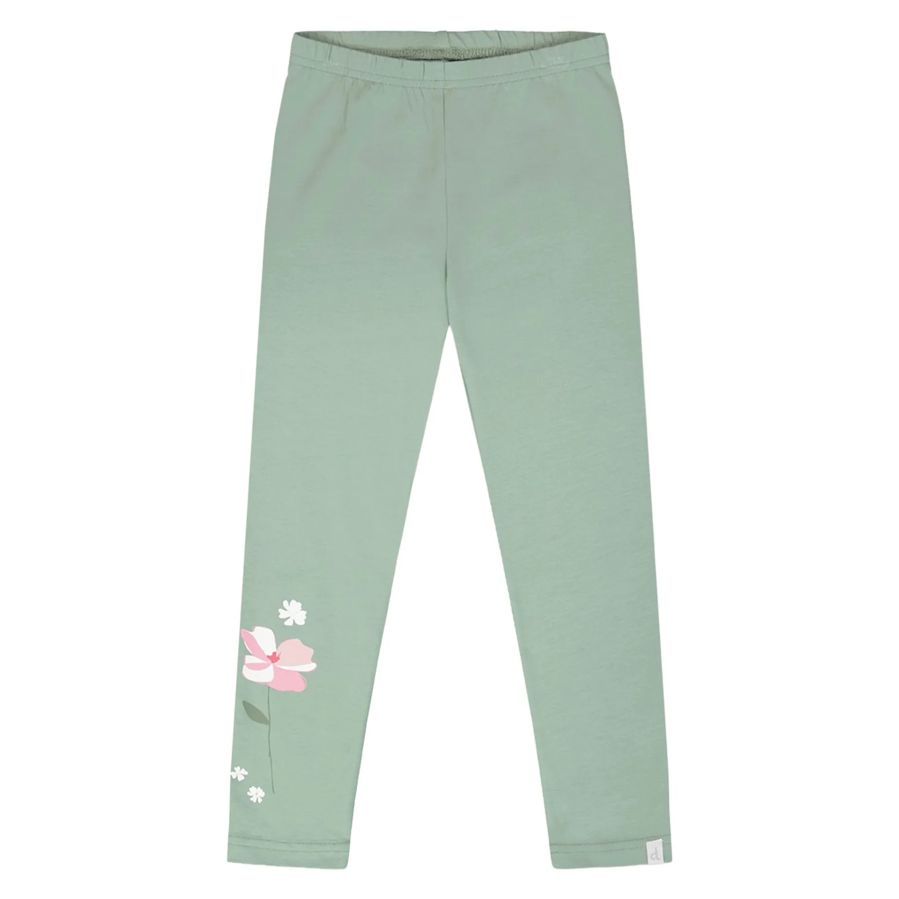 Our organic cotton jersey leggings in sage green are a comfy and versatile essential for everyday wear. These bottoms feature a slim fit with an elastic waistband and a delicate floral print detail at the ankle on one leg. Crafted from a soft organic cotton blend with a hint of stretch, they provide both comfort and flexibility for active days.