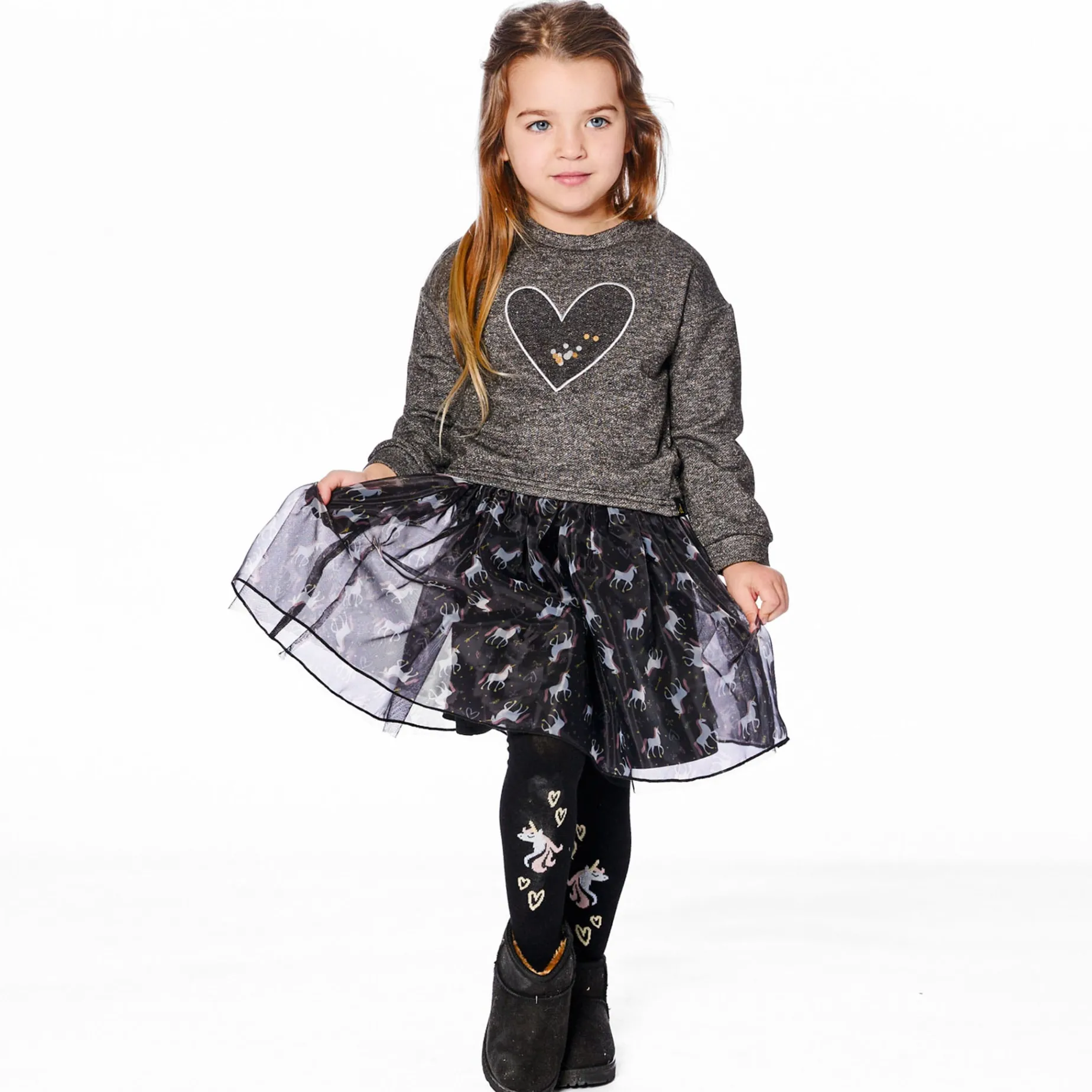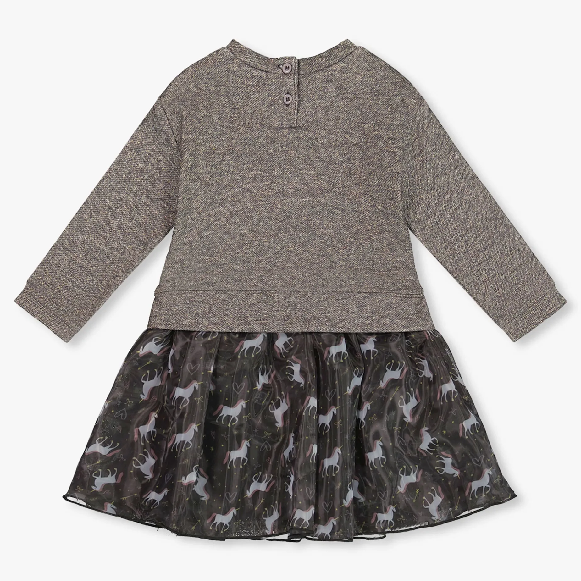 The Bi-Material Dress Dusty Pink With Mesh Skirt and Unicorn brings a magical twist to casual dressing. This dreamy sweatshirt-style dress features a soft french terry bodice with a sparkly unicorn print, and a flared mesh skirt with an allover polka dots print for extra flair. With a comfy fit and playful style, it’s perfect for parties, school, or weekend adventures.