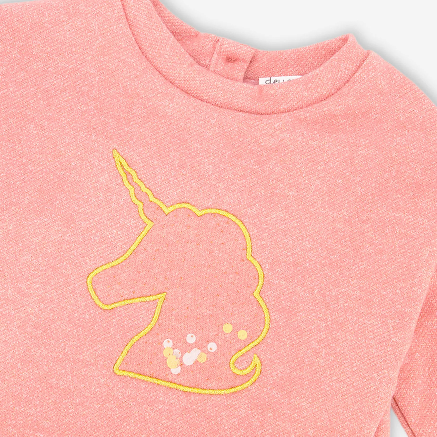 The Bi-Material Dress Dusty Pink With Mesh Skirt and Unicorn brings a magical twist to casual dressing. This dreamy sweatshirt-style dress features a soft french terry bodice with a sparkly unicorn print, and a flared mesh skirt with an allover polka dots print for extra flair. With a comfy fit and playful style, it’s perfect for parties, school, or weekend adventures.