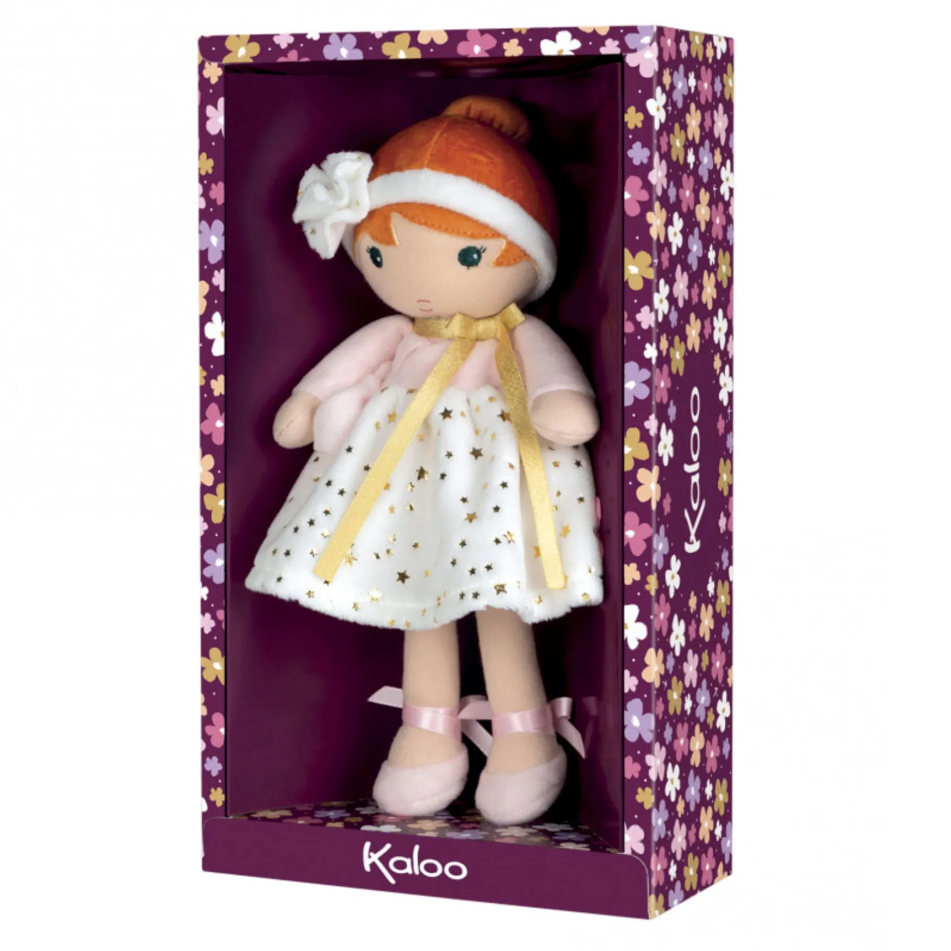Explore the classical dancer who is the stuff of little ballet fans’ dreams! Dressed in a powder pink wrap-over top embellished with a golden scarf and an oh-so-soft champagne-coloured star print skirt, Valentine reveals delicate, refined style. Her red hair distinguishes her from other Tendresse dolls. Machine washable.
