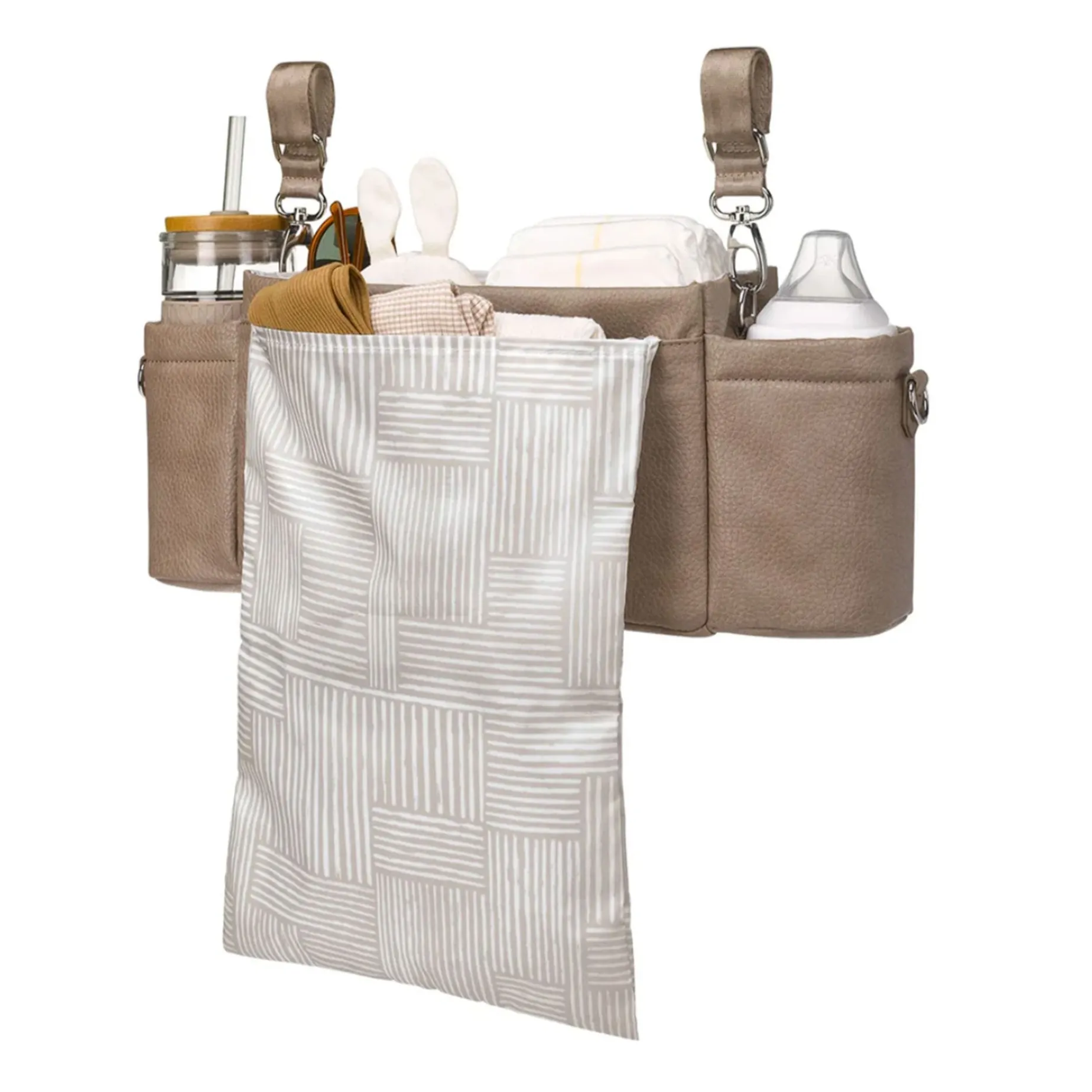 The perfect on-the-go companion, the Wander Stroller Caddy doesn’t miss a step. Smartly designed compartments, insulated cup holders, and a hidden fold-out pocket keep your essentials neatly organized and at-the-ready. Wear it over the shoulder when the stroller is parked or left behind.