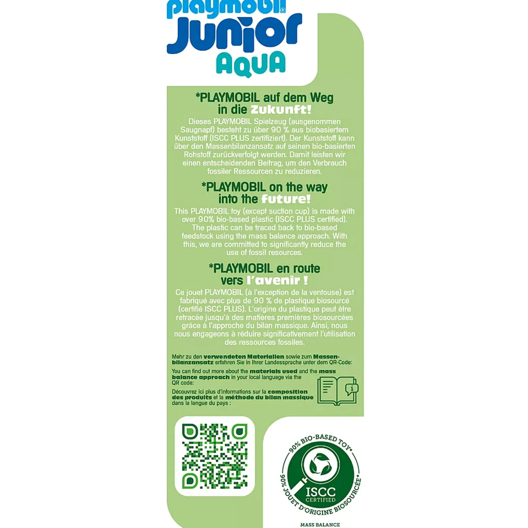 All PLAYMOBIL JUNIOR playsets are also made from more than 90% plant-based plastics, which can be traced to materials from food or paper production, using the mass balance approach in the circular economy. These plastics are as robust and easy to maintain as usual.