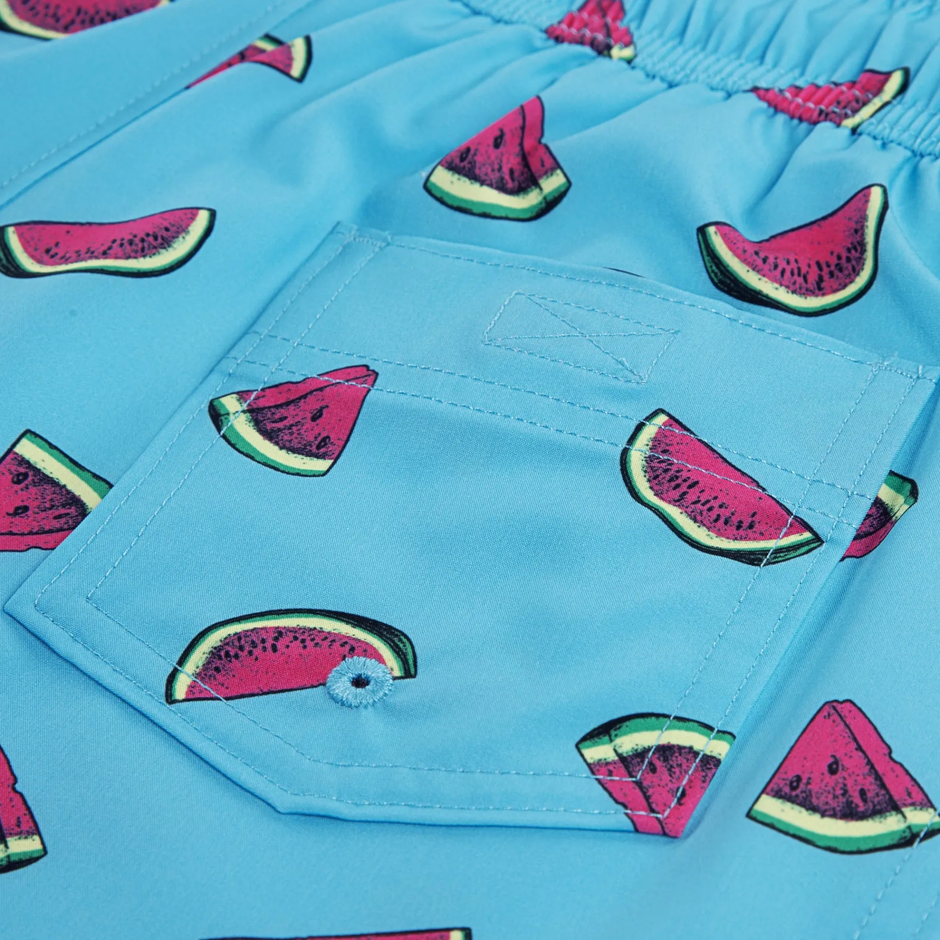 Woven stretch swim trunk fabric with an allover graphic print Encased elastic waistband with drawcord