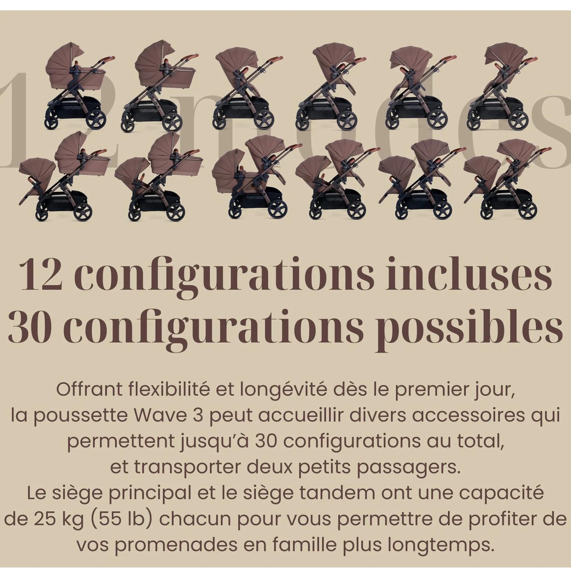 Designed to grow with your family, the Wave 3 is a single-to-double stroller that adapts seamlessly to your needs. Its intelligent system allows for up to 12 configurations straight out of the box and can be expanded with accessories to offer 30 different modes. With a refined design and meticulous finishes, the Wave 3 provides flexibility and comfort, ensuring smooth strolls whether you have one child or more. A stroller designed for today and the future!