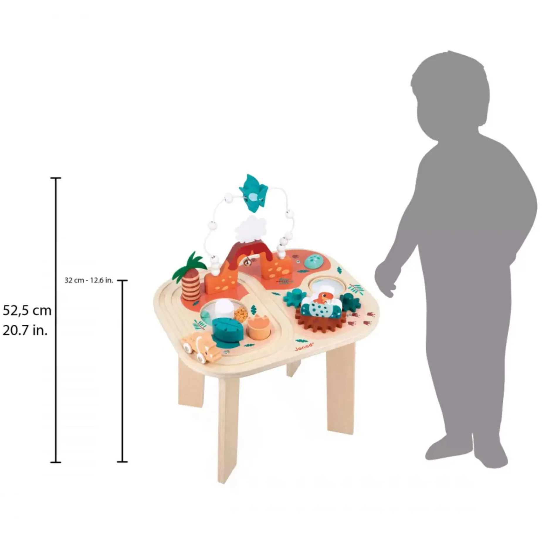 This complete activity game also includes a good visual experience as the rotating egg moves the other small eggs in the tray, plus there are gear wheels, an egg which makes a noise when you turn it and a distorting rotating mirror to make children laugh. All the details on this beautiful wooden early-learning toy are superb: the different play areas are sectioned off with pretty colours, the smoke rising from the volcano is made from very soft felt, and the dinosaurs’ eyes are so round that you’ll want to adopt one of them! This game is made from FSC® wood. The board measures 32 cm high and rests on 4 very stable legs.