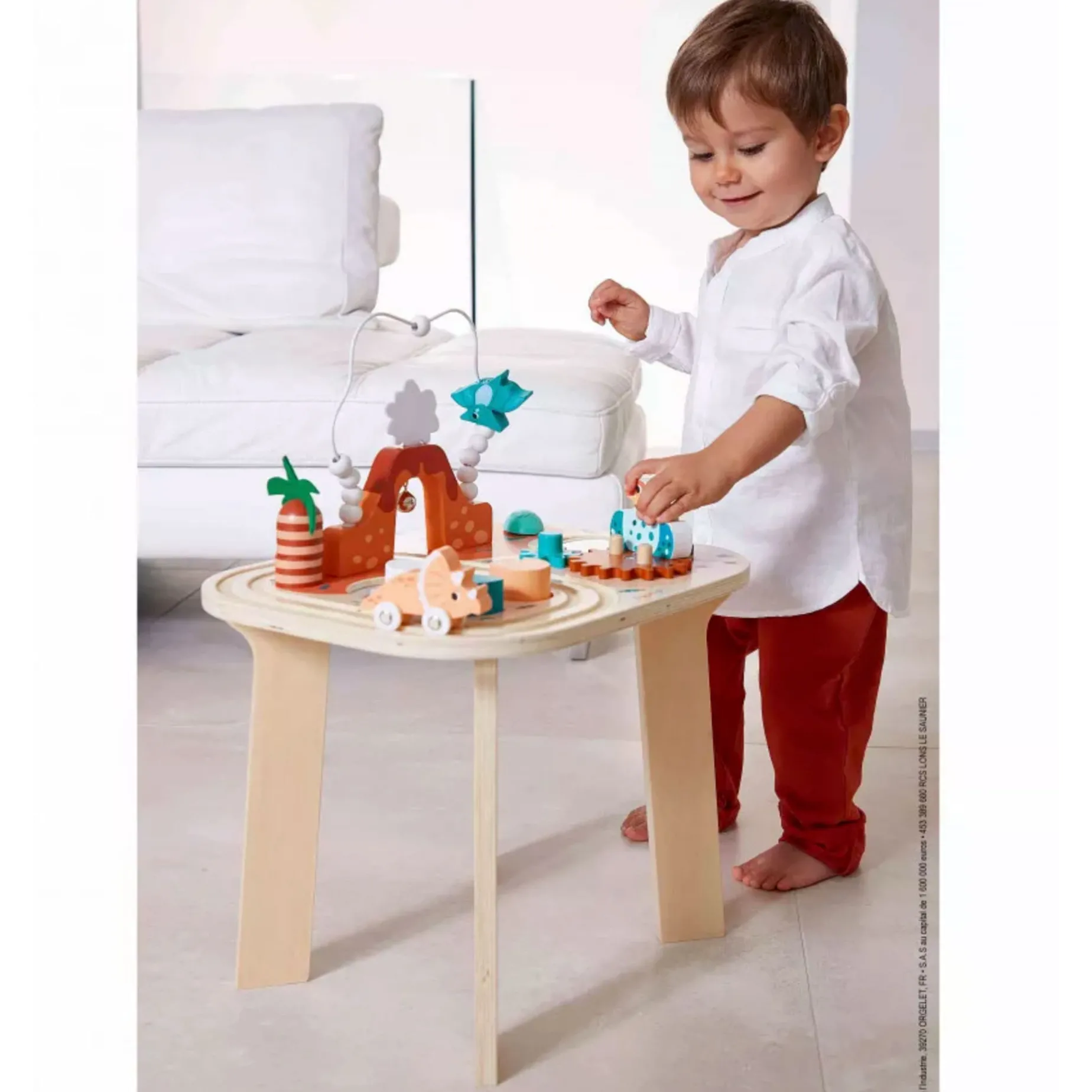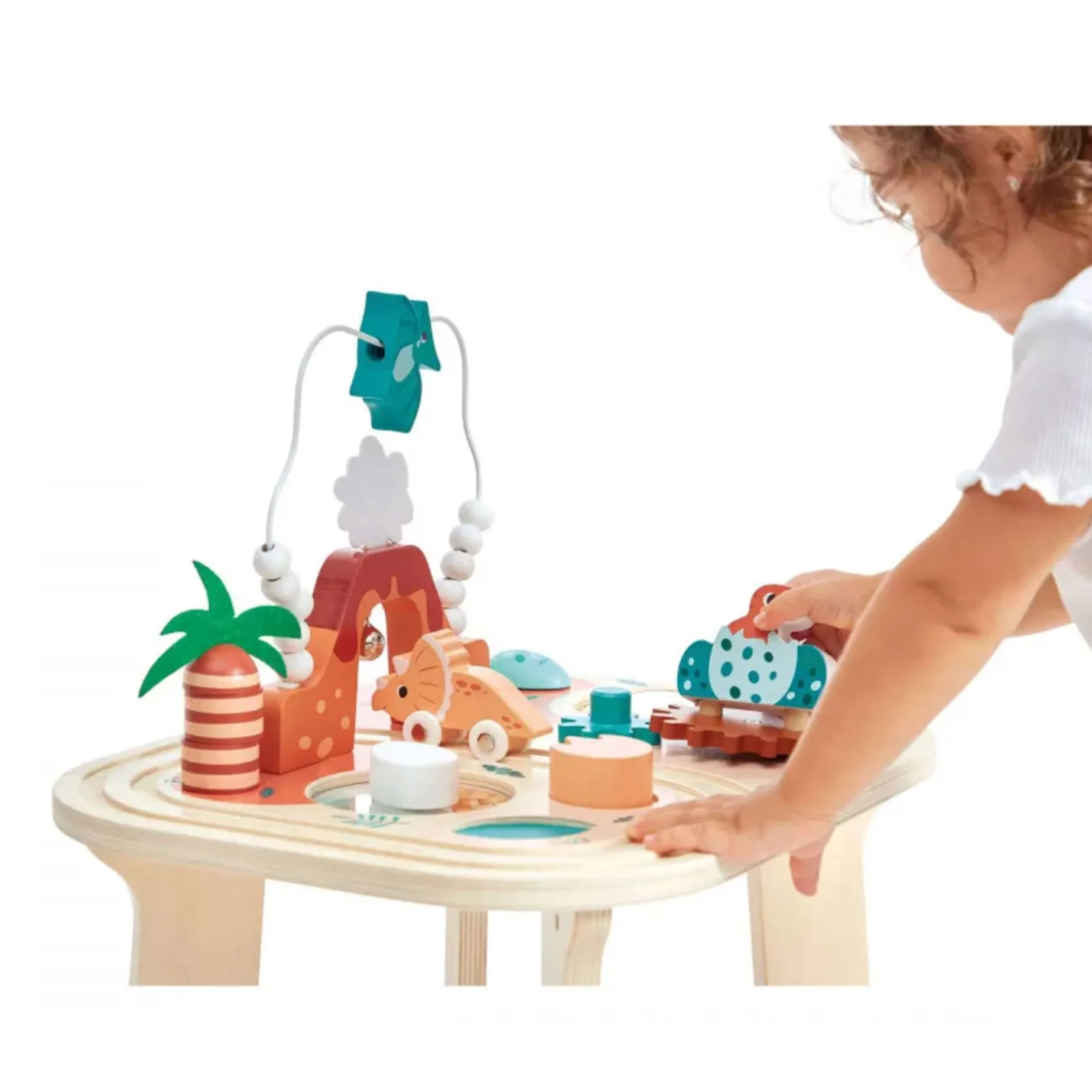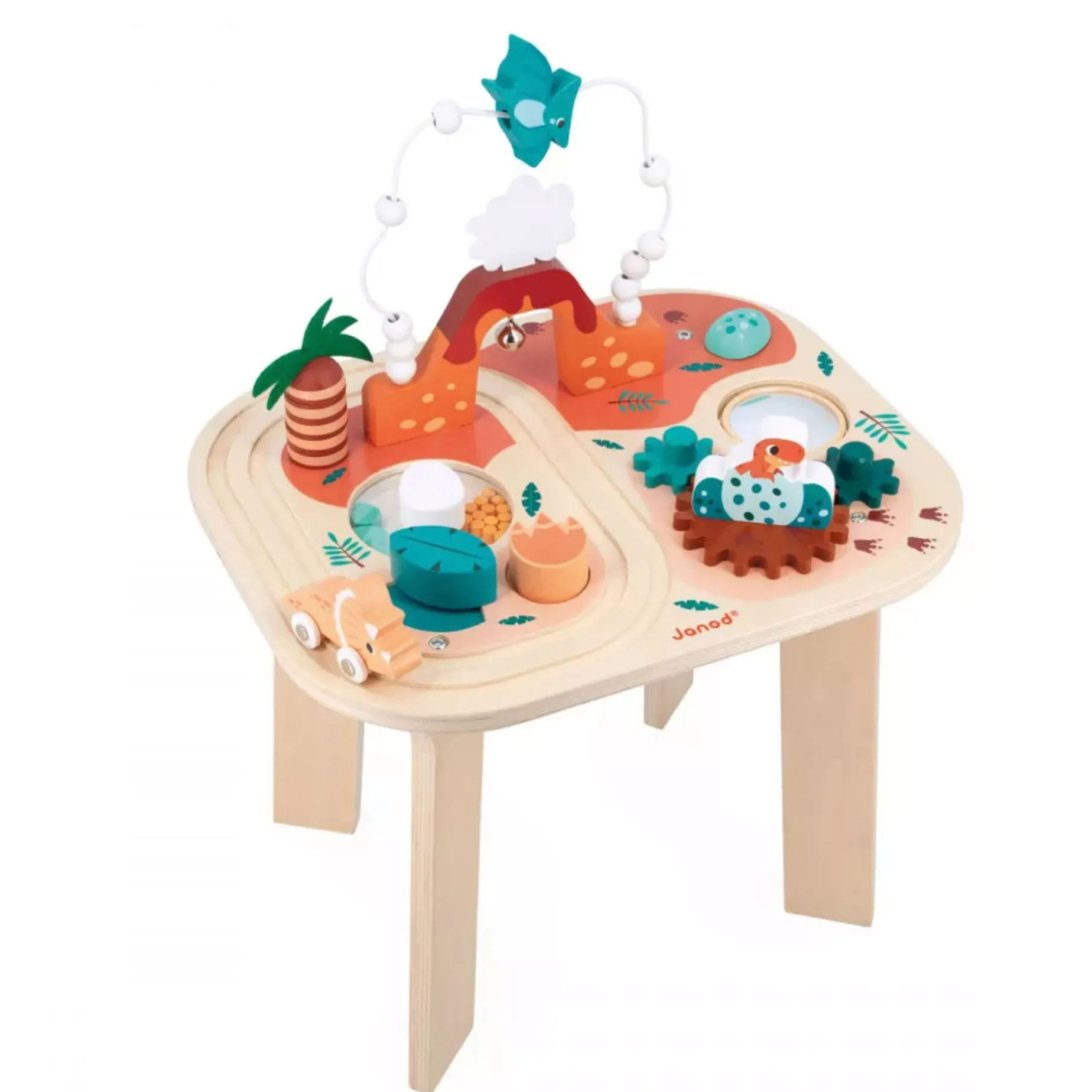 Let’s head back to the prehistoric era, at a time when dinosaurs roamed the earth, much to our little ones delight! On this magnificent rust and blue-toned wooden activity table, everything comes together to transport children aged 12 months and up to an extraordinary universe: a volcano mid-eruption, baby dinosaurs hatching from their eggs and even flying creatures! The day’s schedule for this trip in the heart of the Jurassic – 8 different activities to help develop babies’ curiosity, motor skills and concentration: a triceratops that wheels along its track which passes under the volcano to ring the bell, an abacus comprising 10 wooden beads and a pteranodon in full flight, a 3-piece palm tree-shaped stacking toy, and even slot-in wooden pieces in the shape of a footprint and leaf.