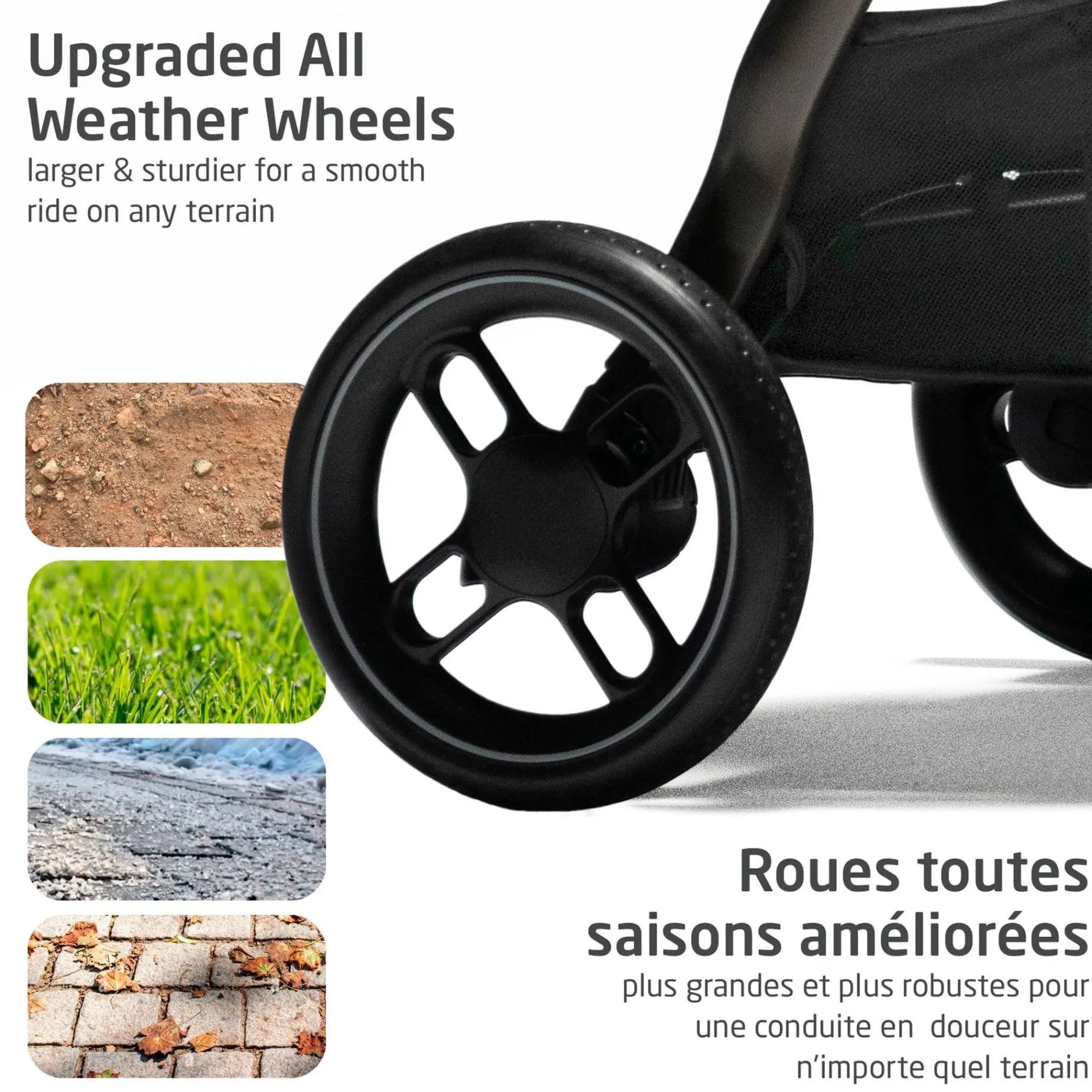 -Designed for Canada:Larger wheels for walks in the city or countryside, including a weather shield and an insulated foot cover to keep your child warm.