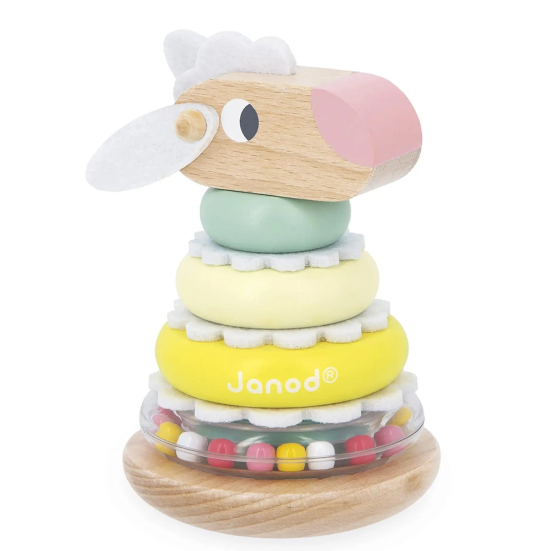 One piece, two pieces… the sheep takes shape again! With this stacking sheep, children as young as 1 year old discover the joys of building, while developing their motor skills and hand-eye coordination. The child gradually assembles each piece: the transparent ring filled with colorful beads, the wooden rings, the felt elements to insert, and finally the sheep’s head. Once the toy is fully stacked, they can shake it to make the beads move inside the ring, adding a sound and sensory dimension to the game. But that’s not all! The sheep also transforms into a roly-poly toy thanks to its rounded base: it rocks gently without ever falling over. An activity that extends the fun! This stacking sheep is from the Zigolos range: a joyful and colorful collection with playful shapes, designed to awaken the senses and accompany toddlers in their first discoveries. This developmental toy is made with FSC™ certified wood and water-based paint.